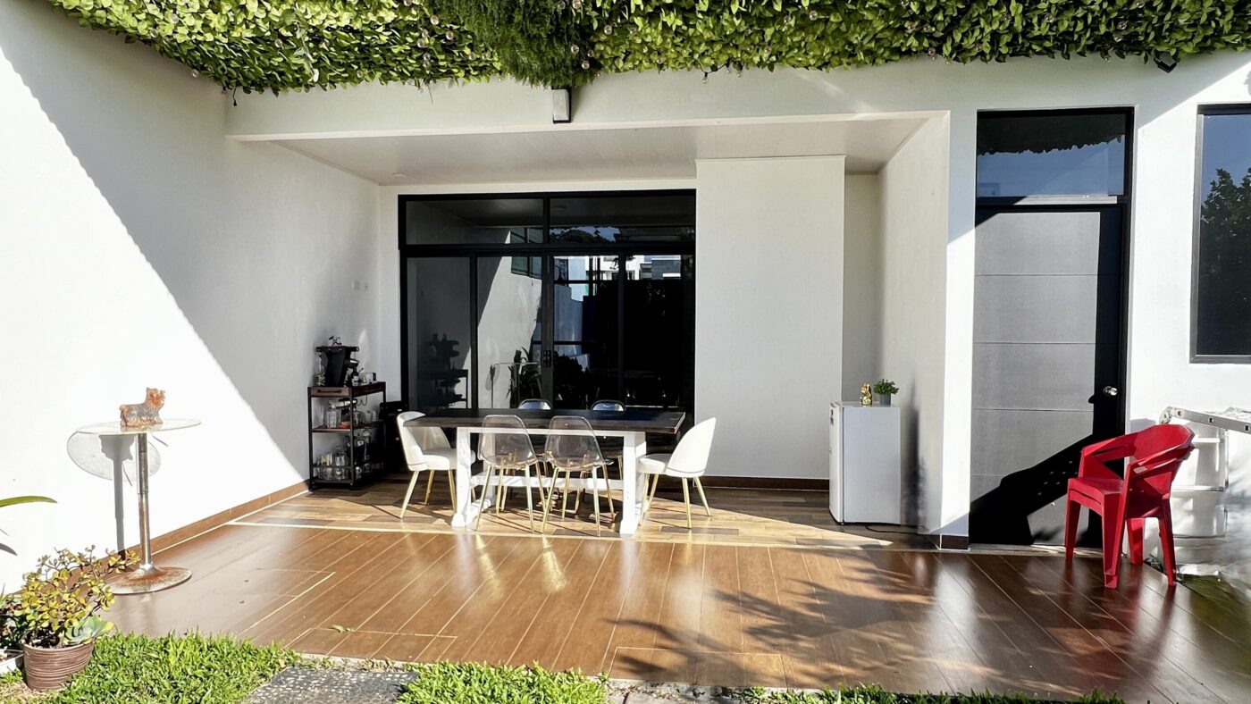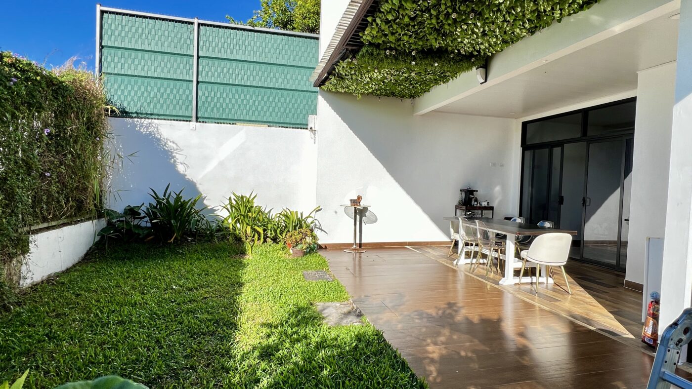 La casa es de dos niveles y cuenta, en la primera planta, con un amplio espacio abierto que integra sala, comedor y cocina. La cocina ofrece abundante espacio de almacenamiento y una cómoda isla. En este nivel también se ubica un medio baño. Desde el área social se accede, mediante puertas corredizas de vidrio, a una terraza ideal para reuniones, conectada a un patio espacioso con un encantador árbol de limón.