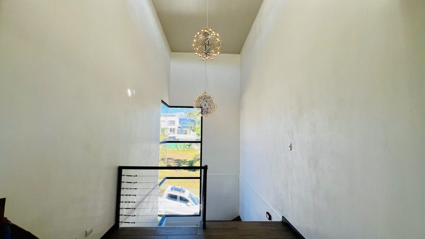 En la planta alta se encuentra el dormitorio principal, con walk-in closet y baño privado, además de dos dormitorios secundarios que comparten un baño completo. Un área de recibidor conecta los dormitorios y aporta amplitud. Desde el dormitorio principal y uno de los dormitorios secundarios se accede a un balcón posterior con preciosas vistas.