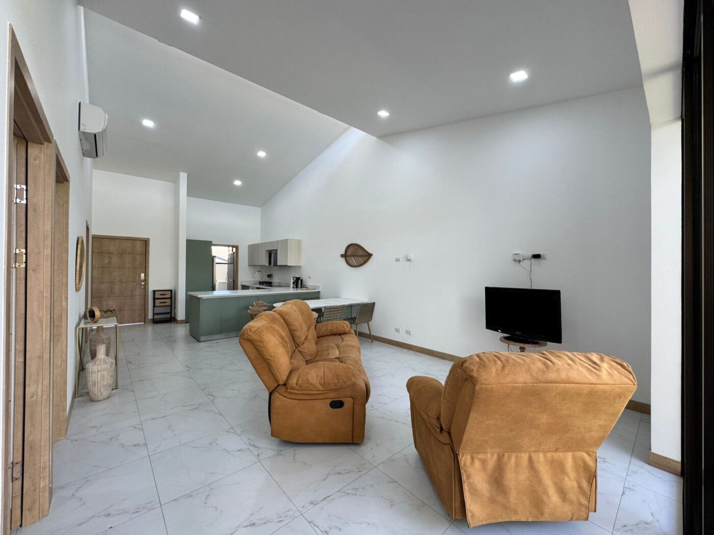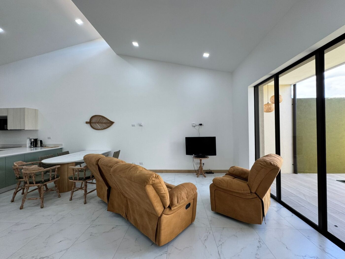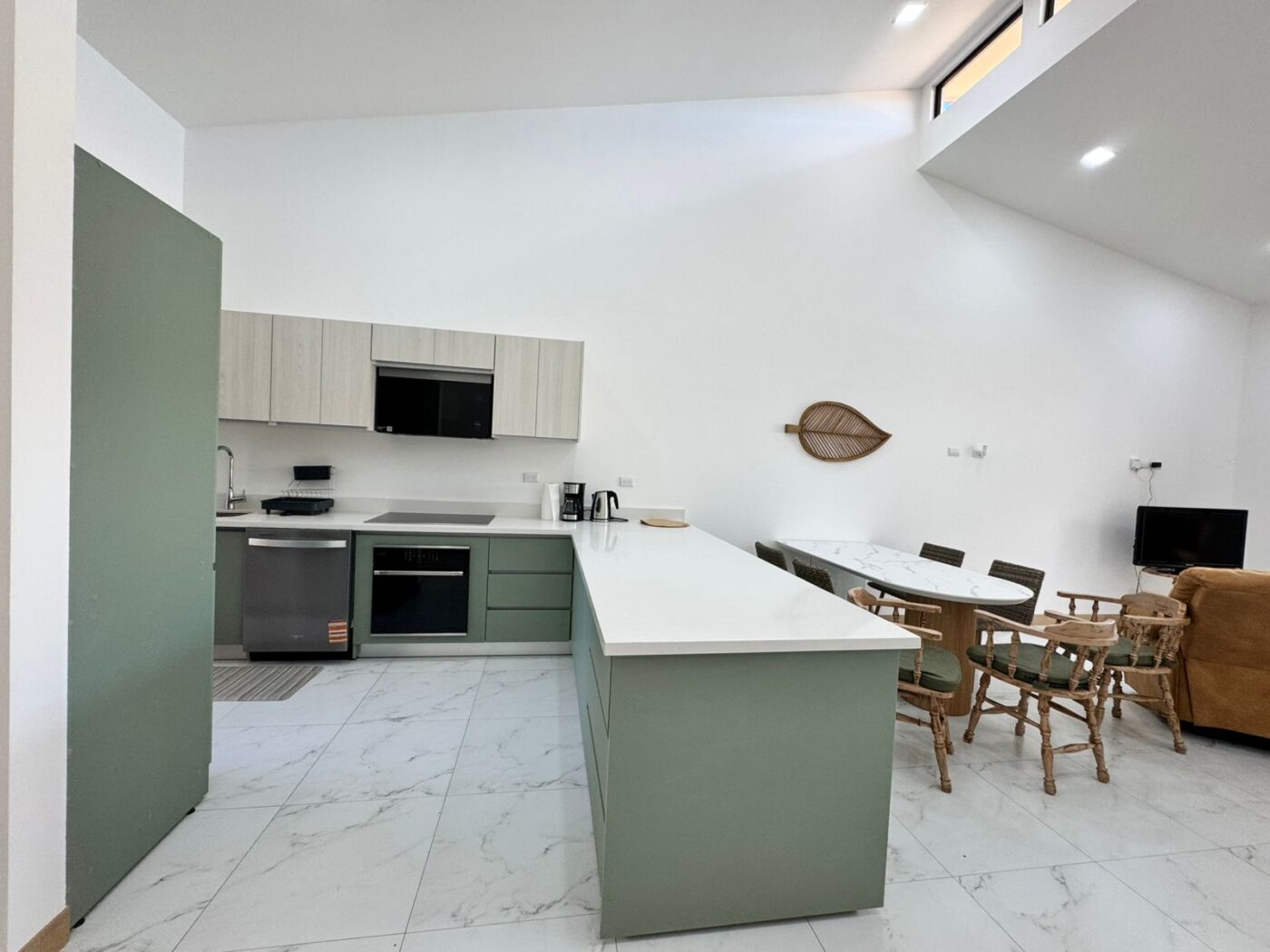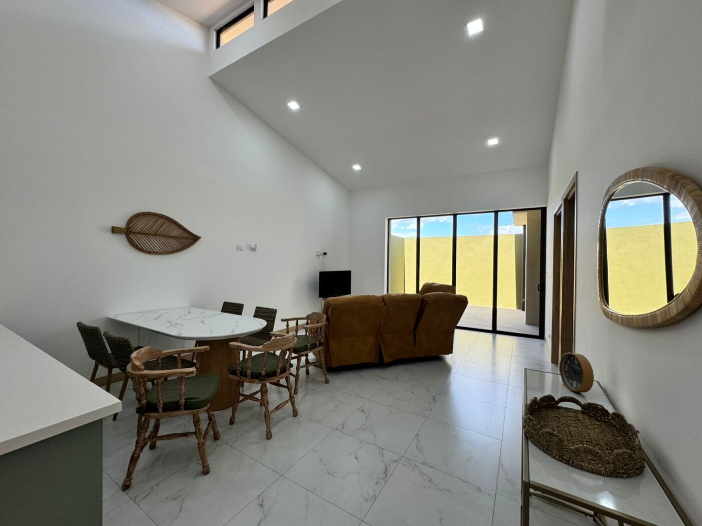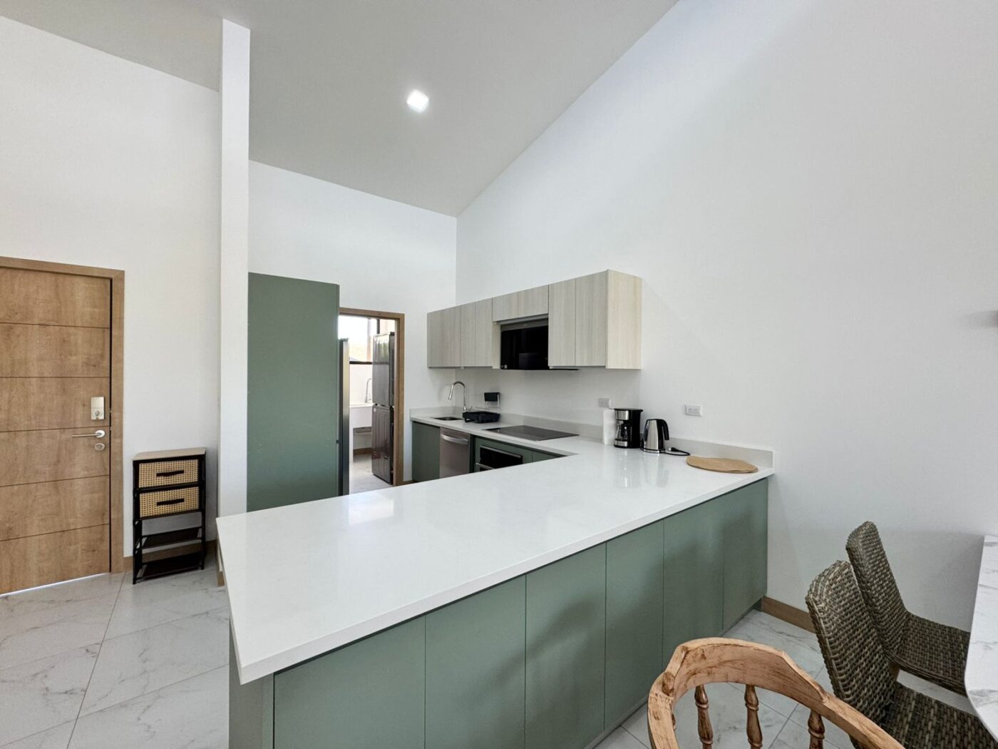 Al ingresar, se aprecia un diseño de concepto abierto que integra armoniosamente la cocina, la sala de estar y el área de comedor, creando un ambiente amplio y luminoso. Las puertas de vidrio deslizables que conectan con la terraza se abren completamente, permitiendo una excelente ventilación natural y ampliando el espacio social hacia el exterior.