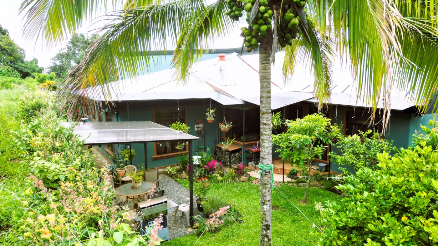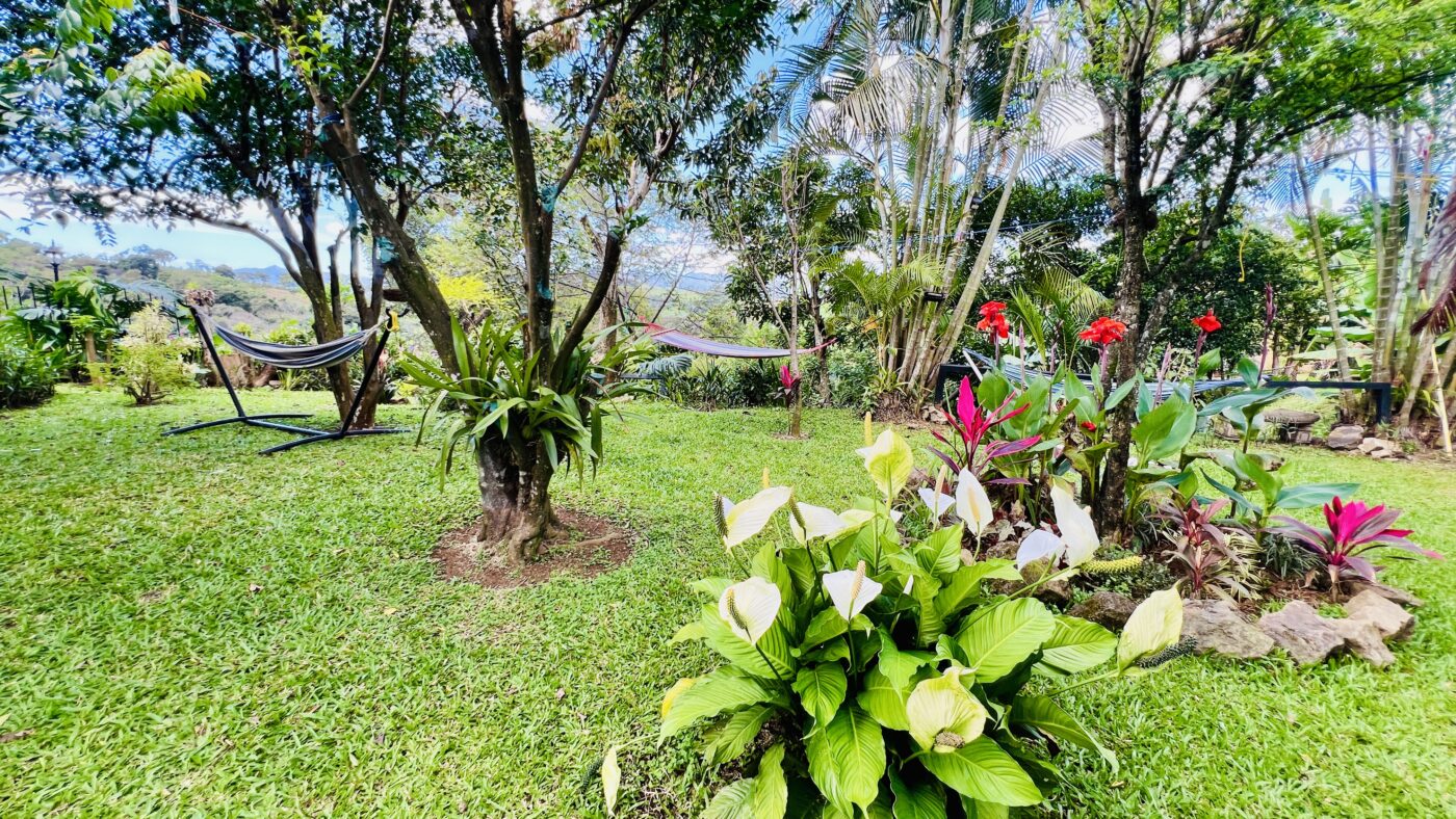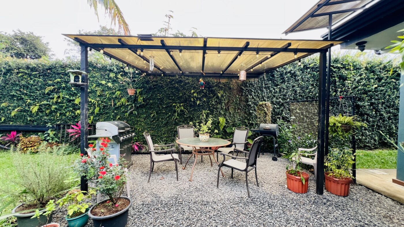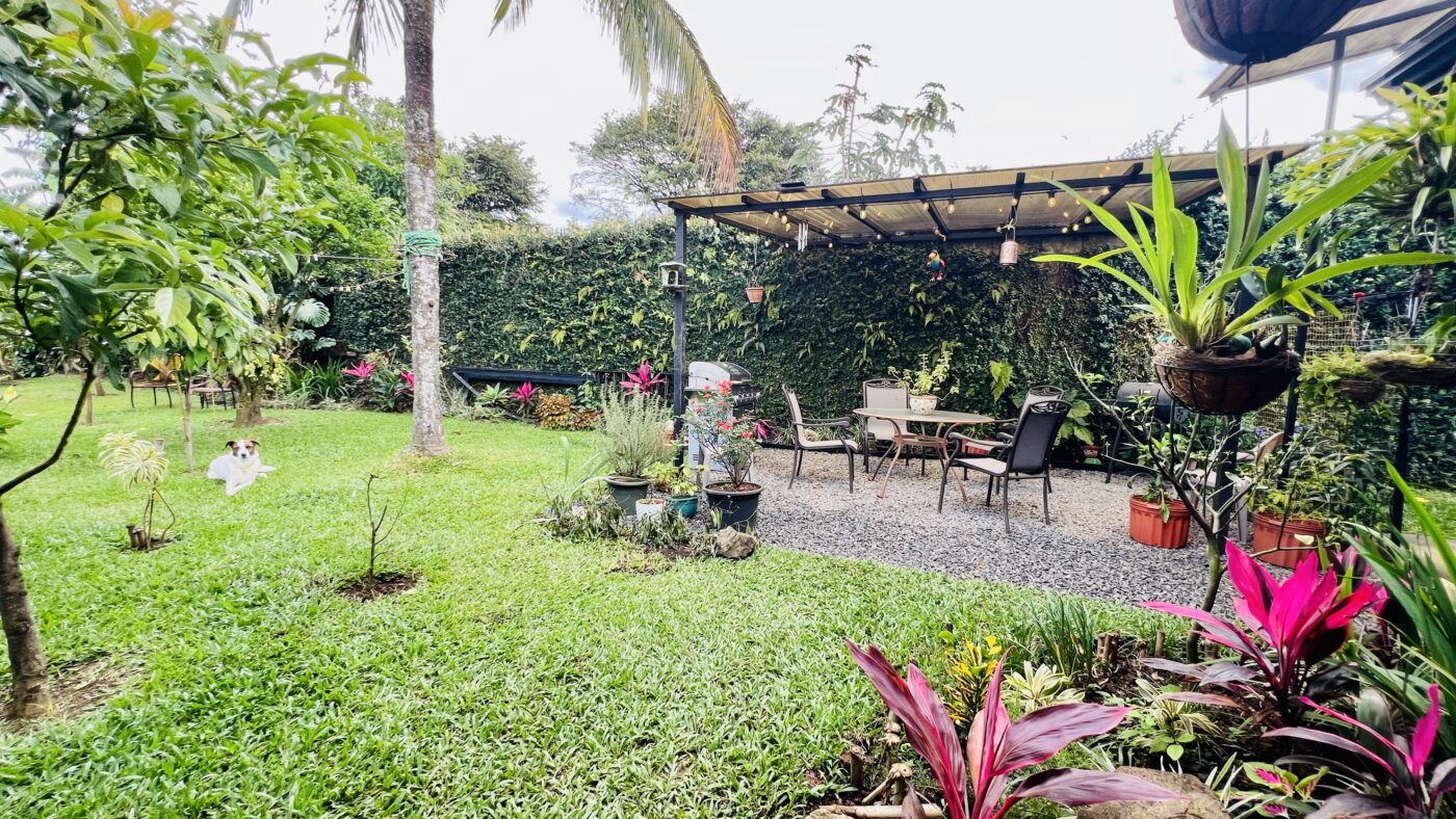 La casa está construida en un lote de más de 1,000 m², rodeada de jardines maduros y árboles frutales como aguacates, mandarinas y limones, además de flores que atraen colibríes y mariposas.