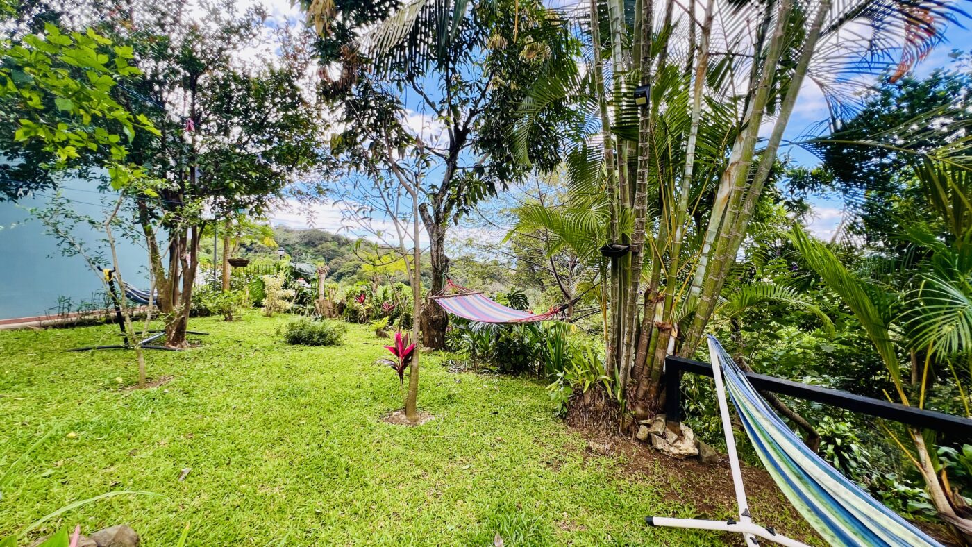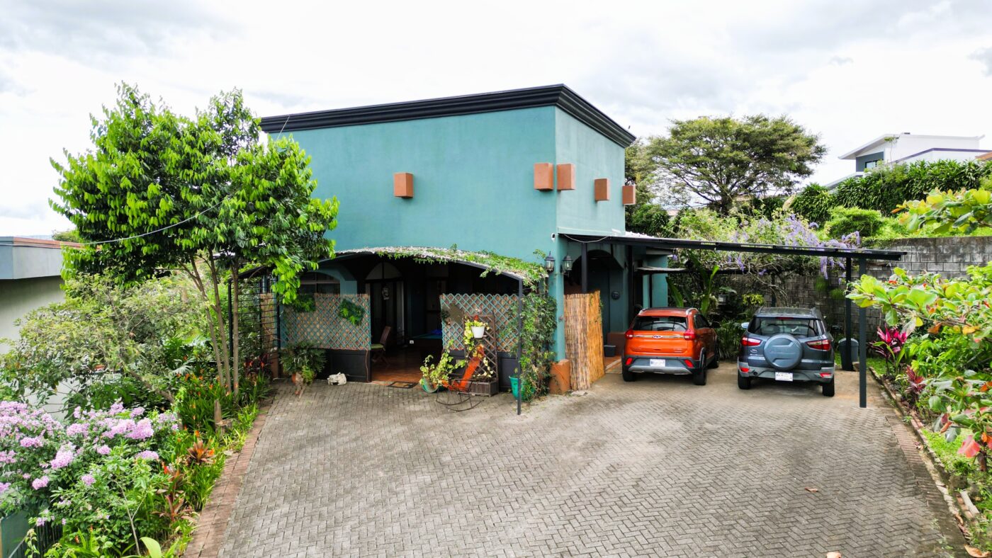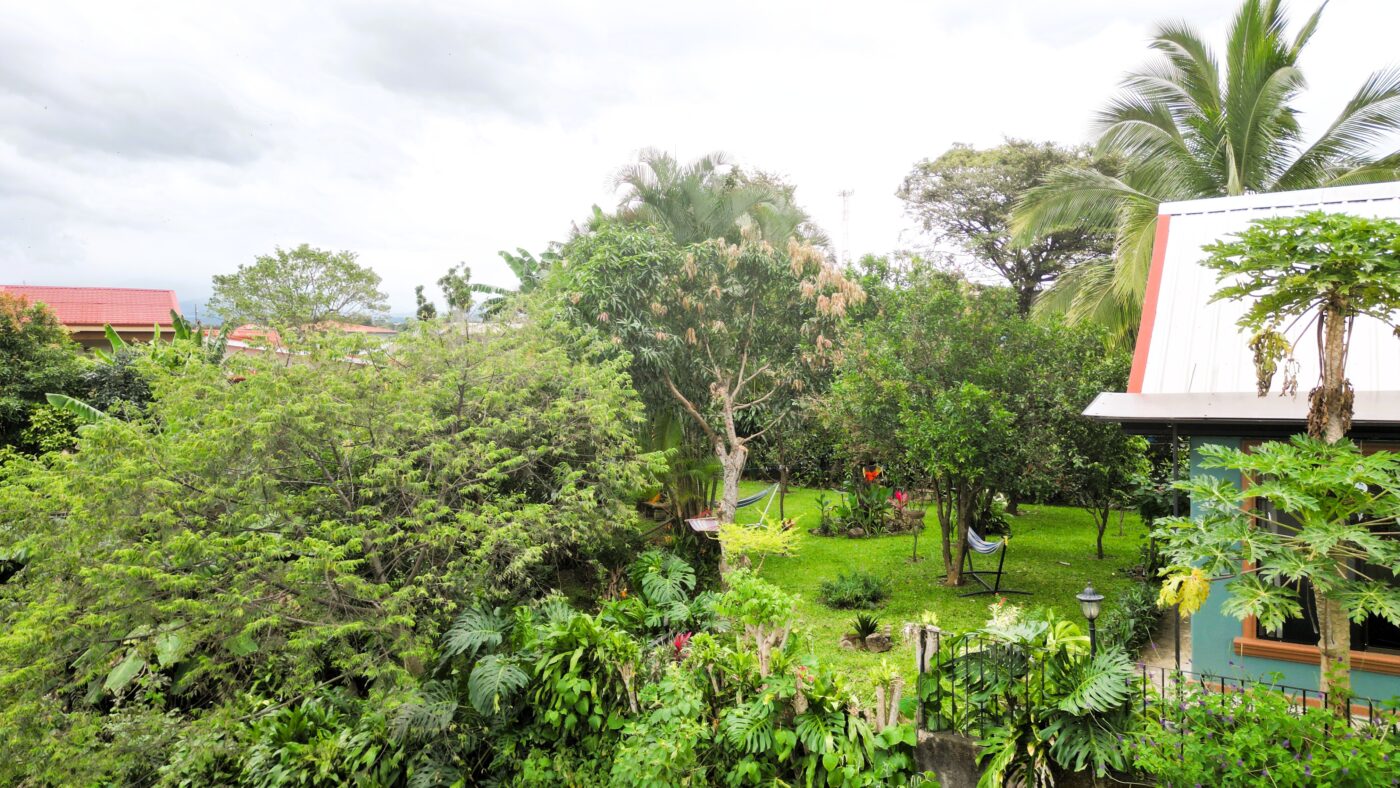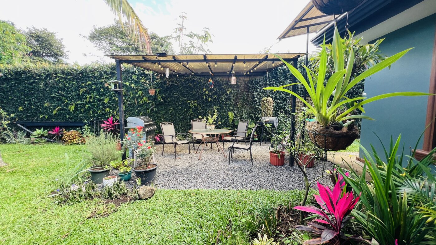 La casa está construida en un lote de más de 1,000 m², rodeada de jardines maduros y árboles frutales como aguacates, mandarinas y limones, además de flores que atraen colibríes y mariposas.