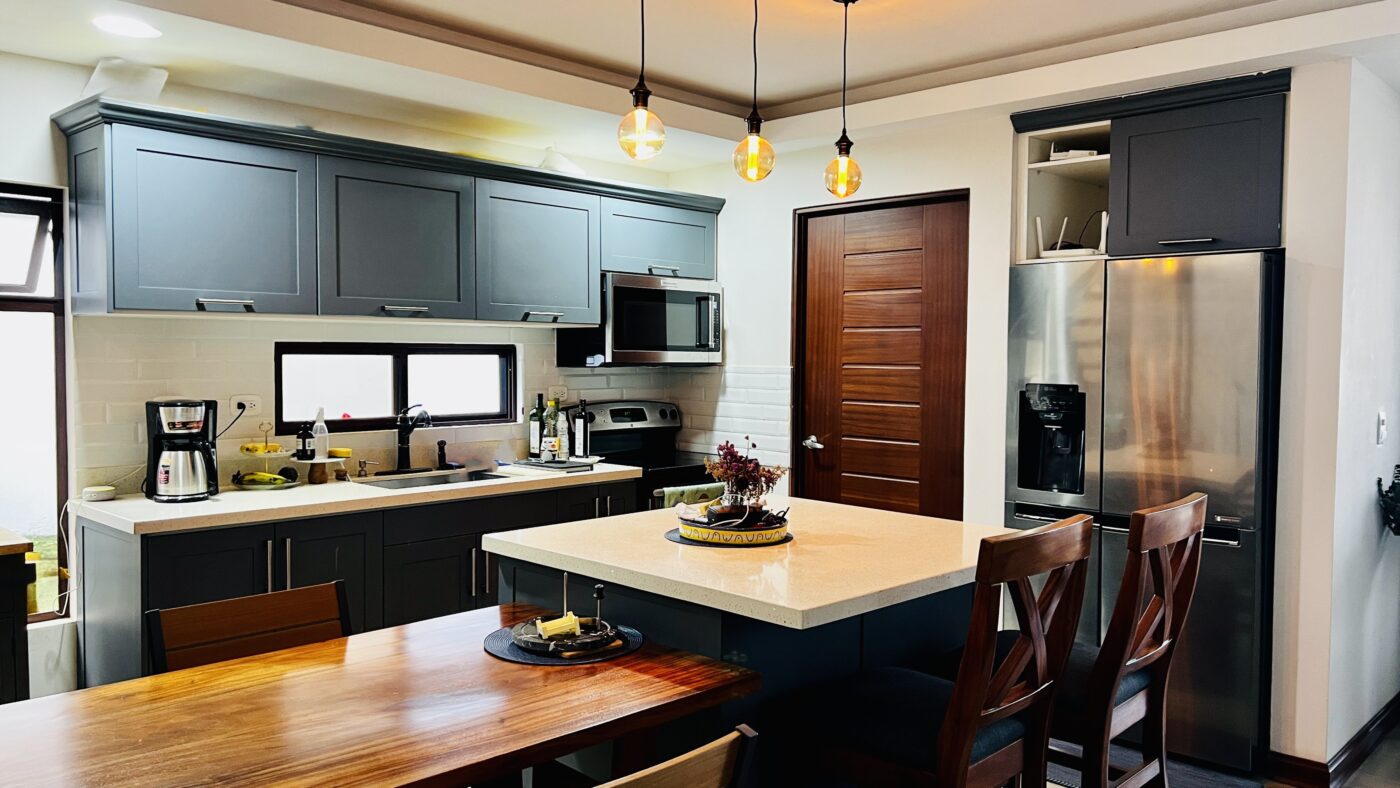 -Kitchen with a large quartz island and abundant cabinet space.