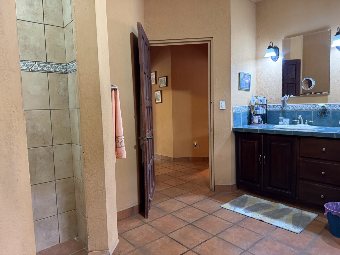 On the opposite side, the guest quarters are currently configured as a separate apartment. This area includes a spacious bedroom with a large bathroom, a cozy secondary living space (or optional bedroom), a small kitchen, and a private entrance. A dividing door allows this section to function independently from the main home, making it ideal for guests, rental income, or extended family.