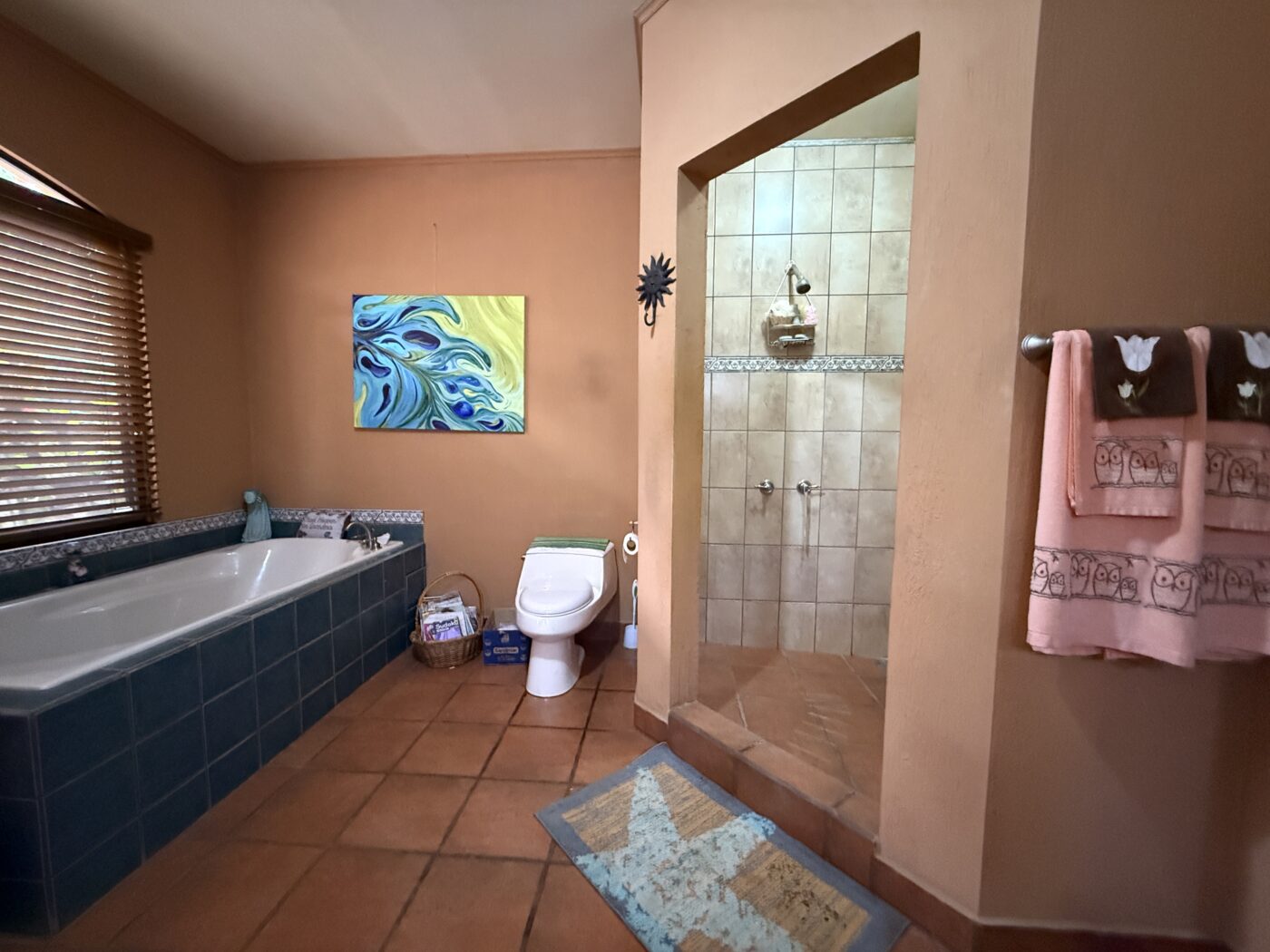 The primary bedroom suite occupies its own wing of the home, offering privacy and comfort. It includes a walk-in closet, a spacious en-suite bathroom with both a shower and bathtub, and direct access to the terrace.