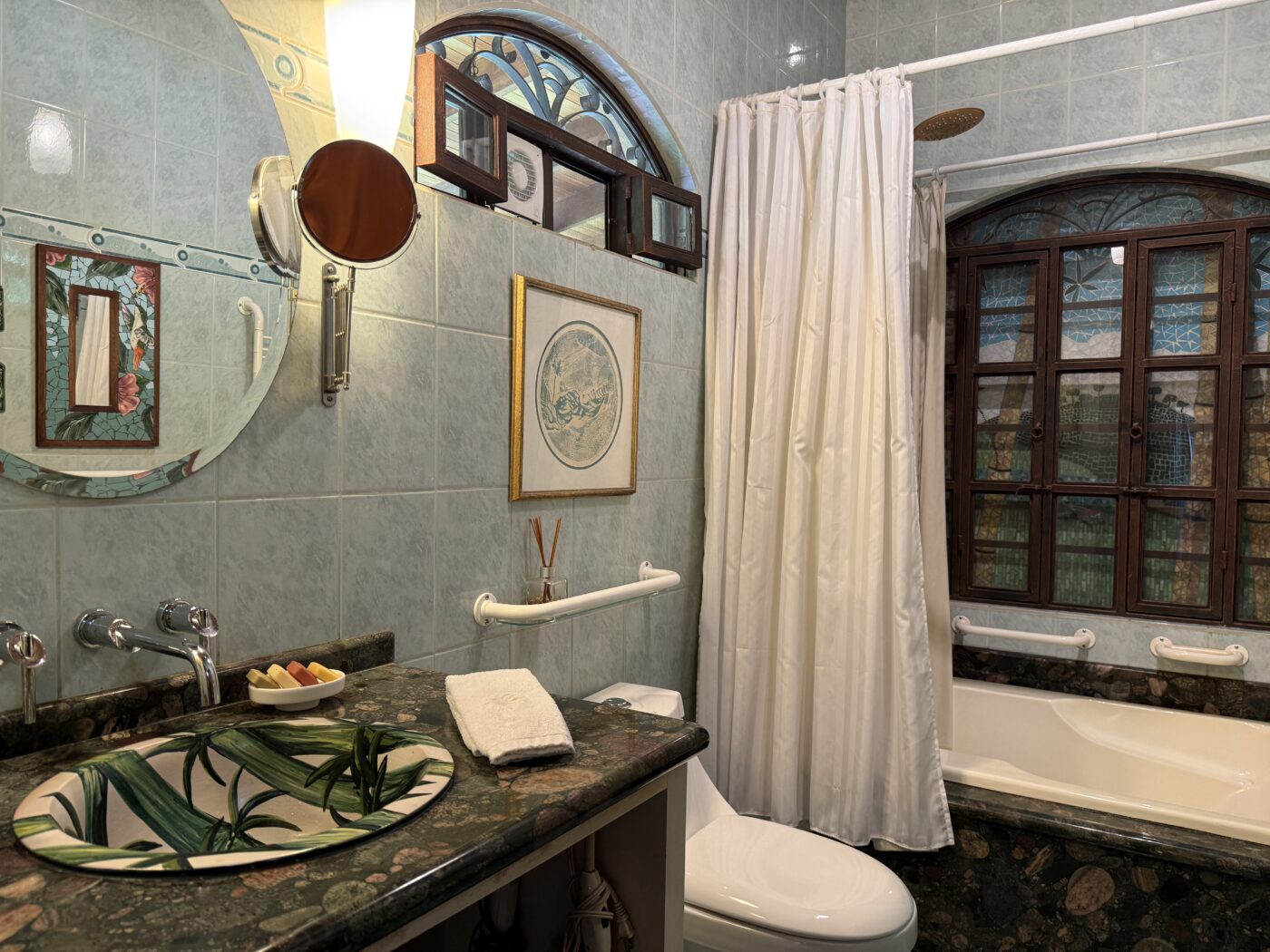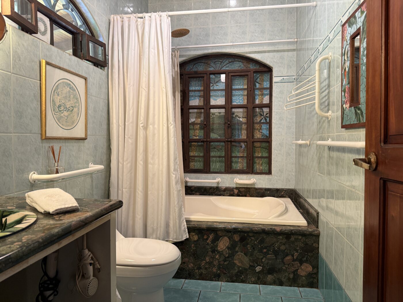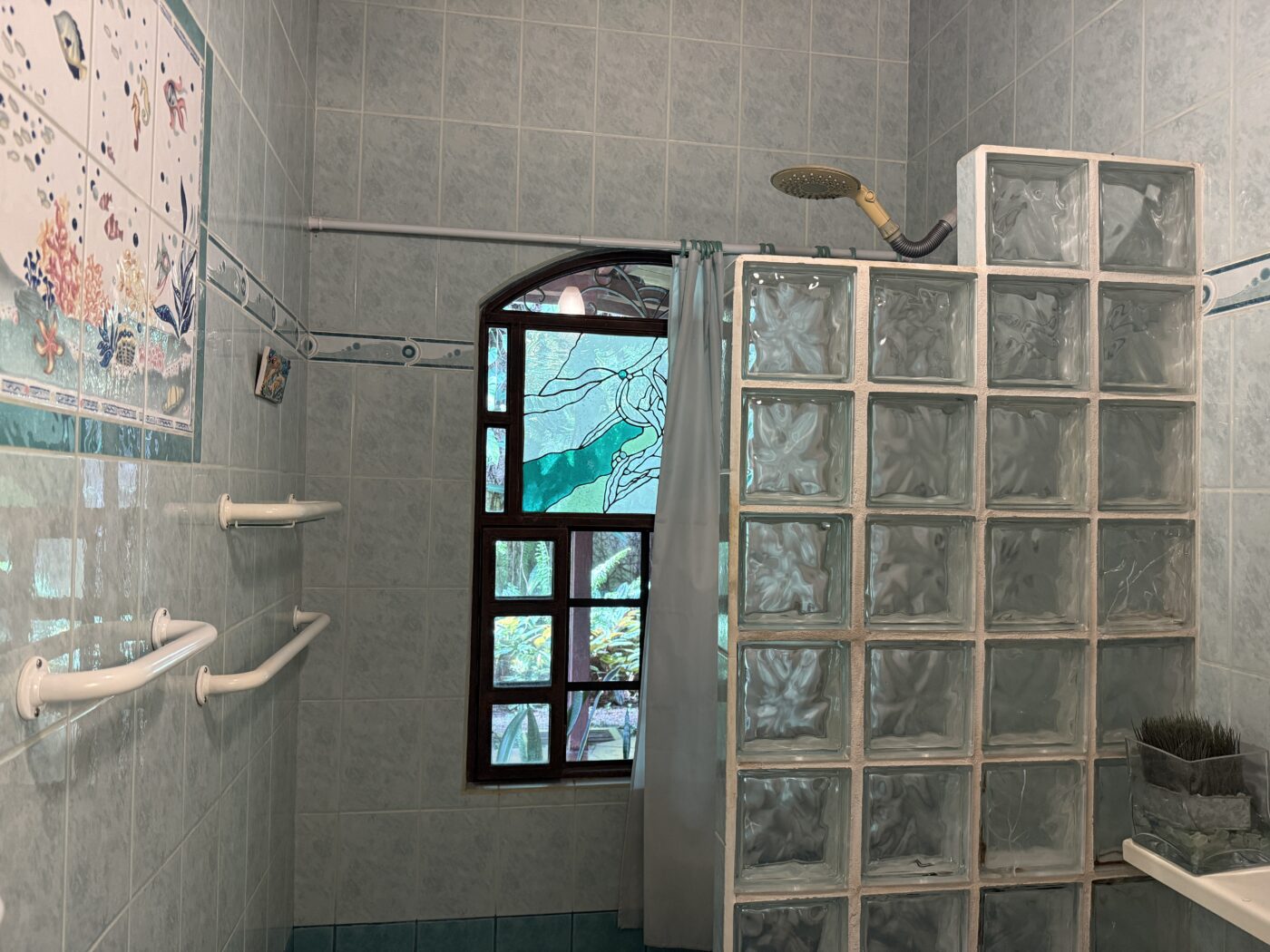 The other side of the house has another suite with a spacious bedroom, closet space, with door’s on each side of the room leading to the terraces. The bathroom is cheerful with lots of pretty tile.