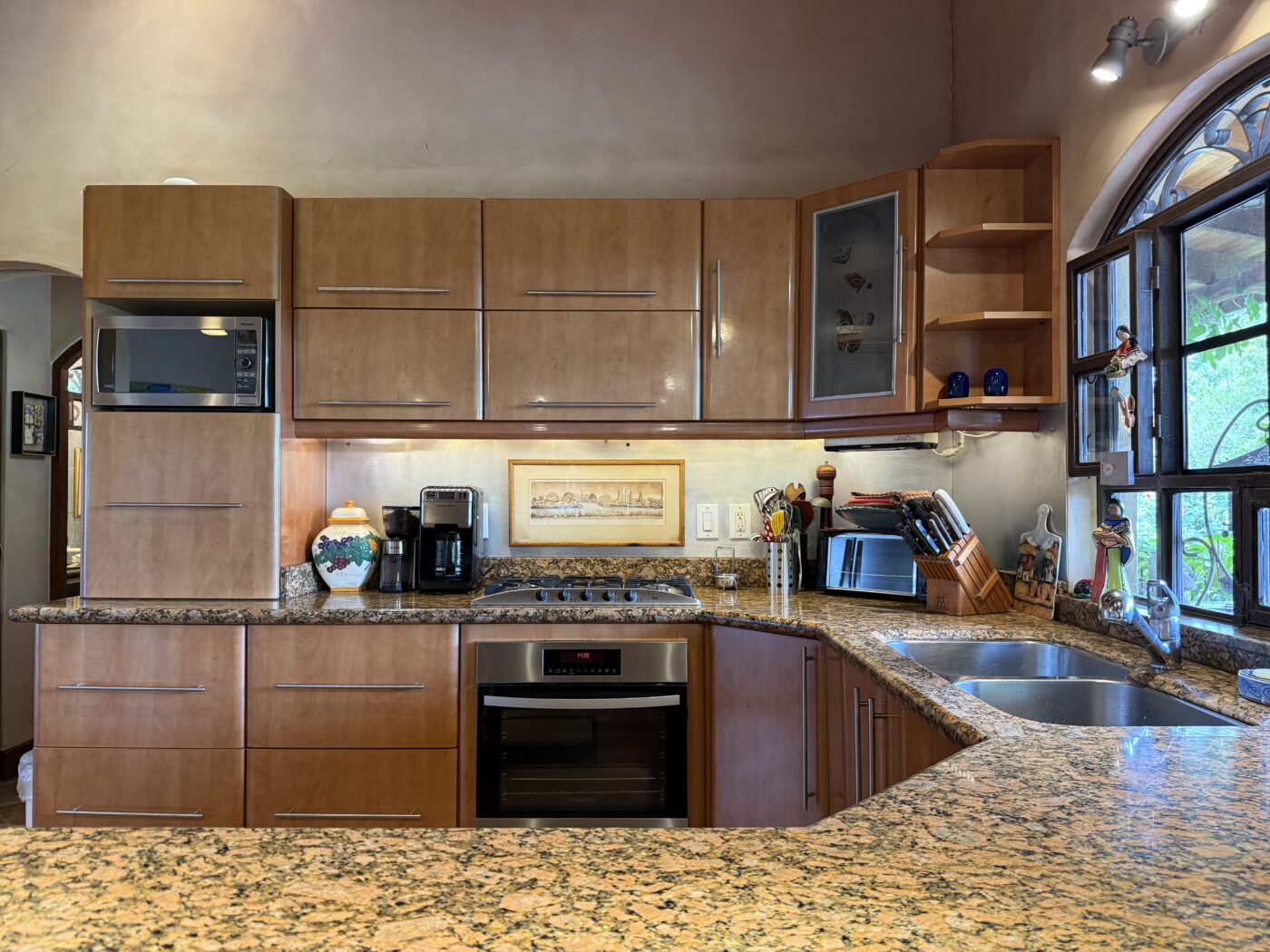 The kitchen features tons of storage and very pretty counter-tops. The window looks out to the pretty views and the gardens. There is a lot of counter space for working!