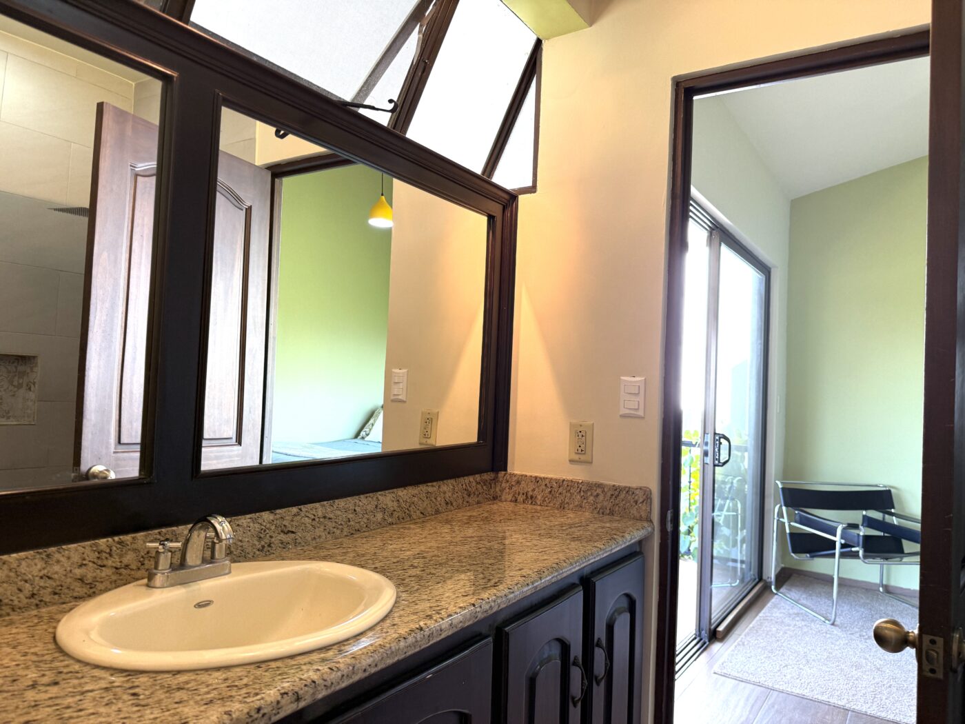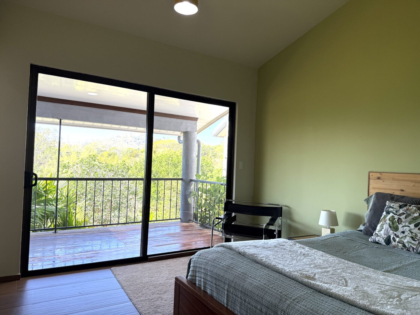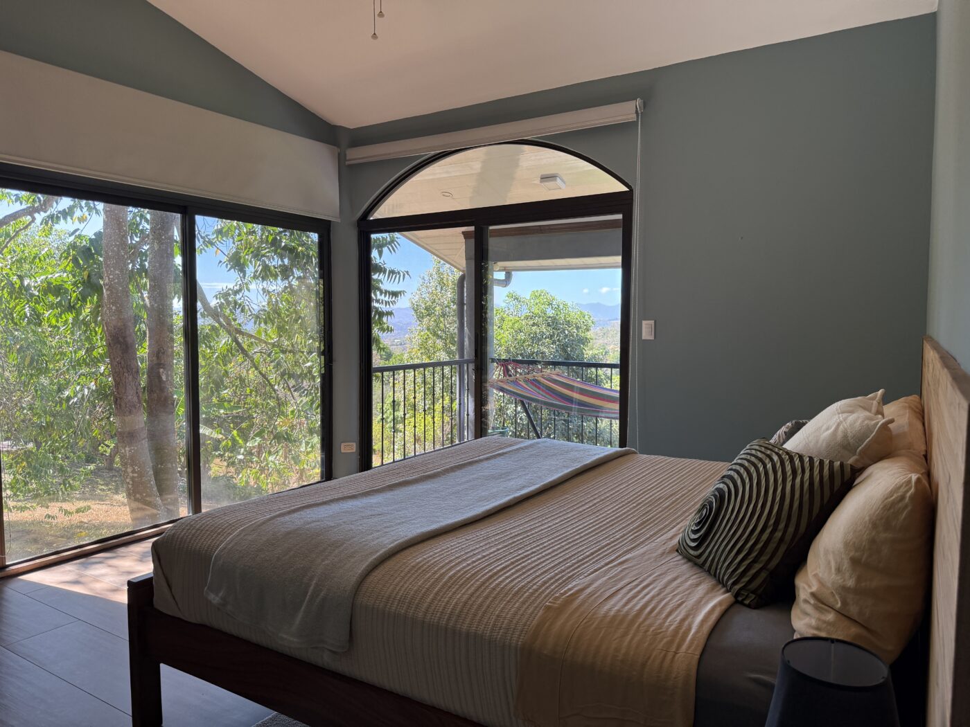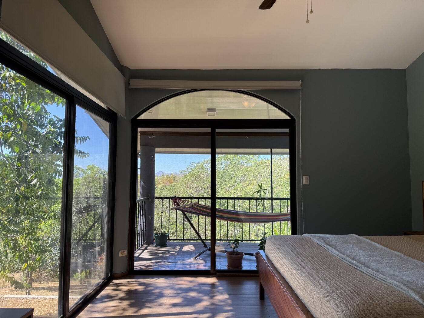 The hallway leading to the bedroom features a glass wall where you can observe your gorgeous gardens and the views beyond. Both bedrooms share a huge terrace accessible by sliding glass doors. The beautiful wood terrace is the perfect place for your hammock, rocking chairs or even a little table for having refreshments. You will enjoy toucans and other tropical birds from here and you may even here a monkey!