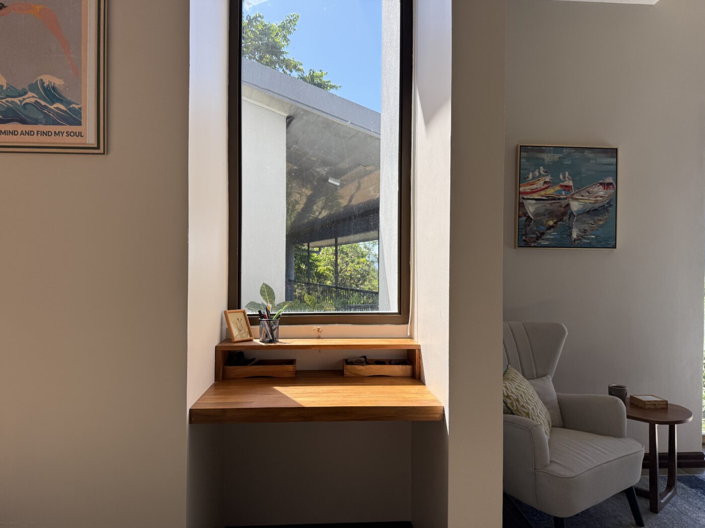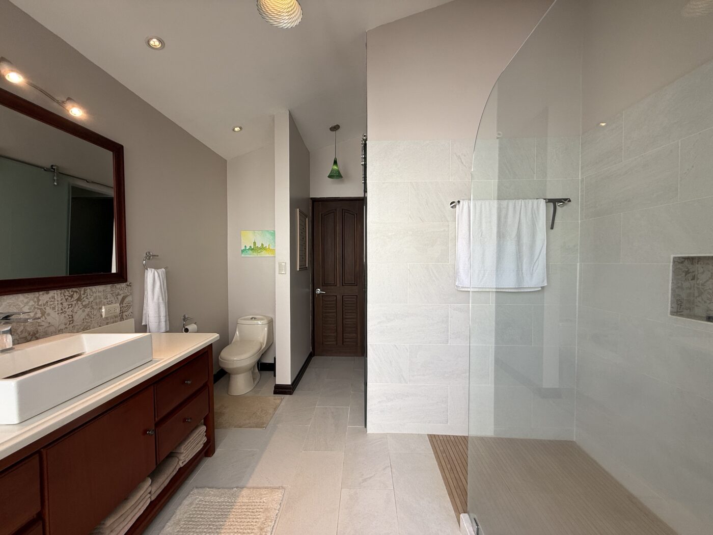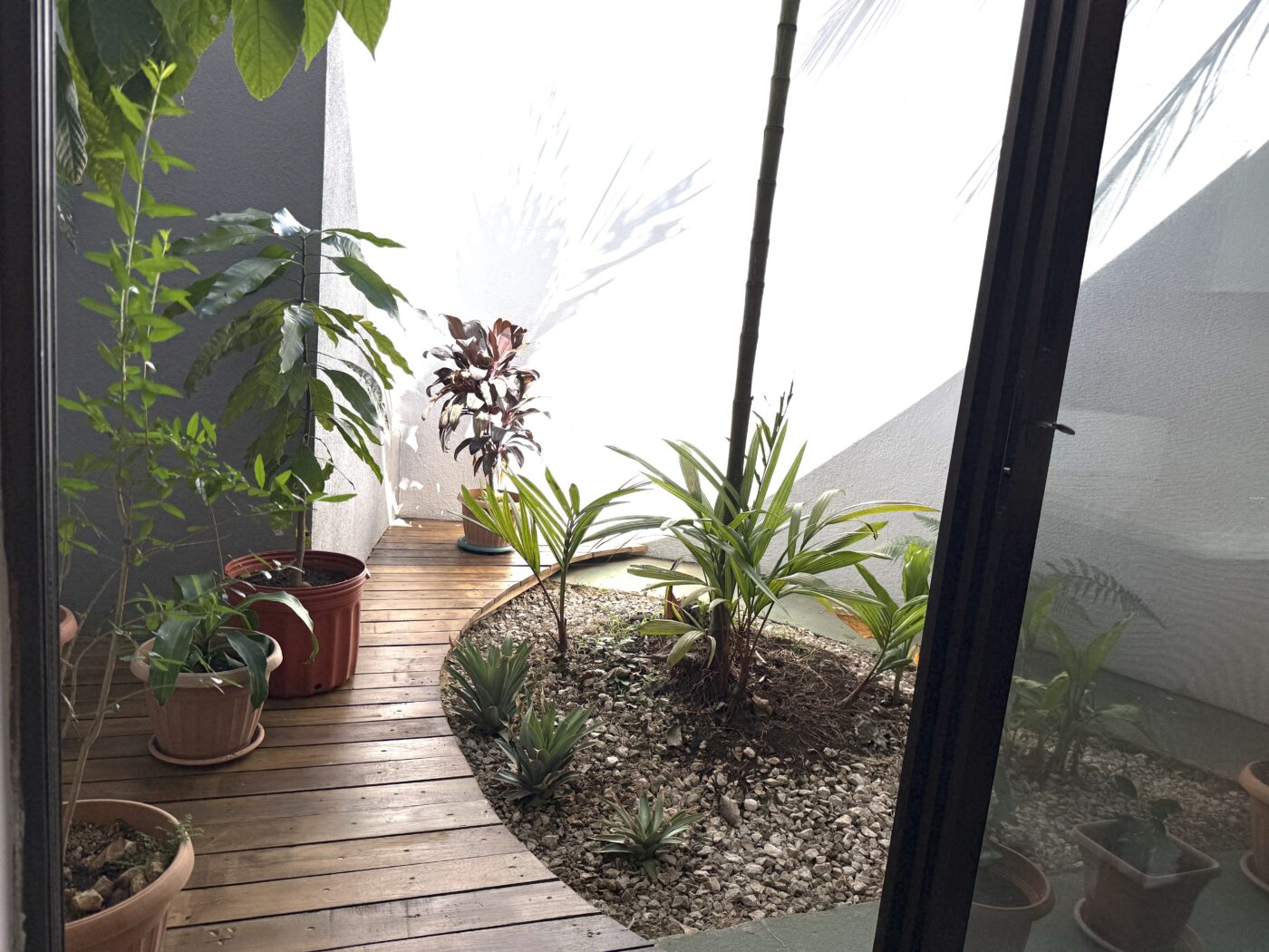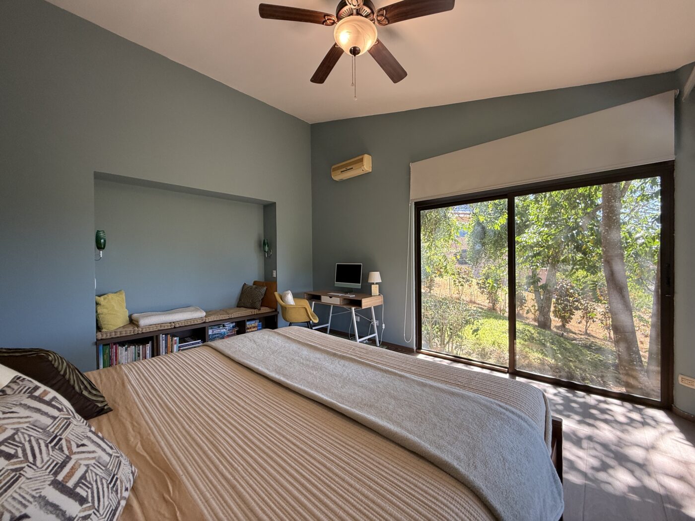 The hallway leading to the bedroom features a glass wall where you can observe your gorgeous gardens and the views beyond. Both bedrooms share a huge terrace accessible by sliding glass doors. The beautiful wood terrace is the perfect place for your hammock, rocking chairs or even a little table for having refreshments. You will enjoy toucans and other tropical birds from here and you may even here a monkey!
