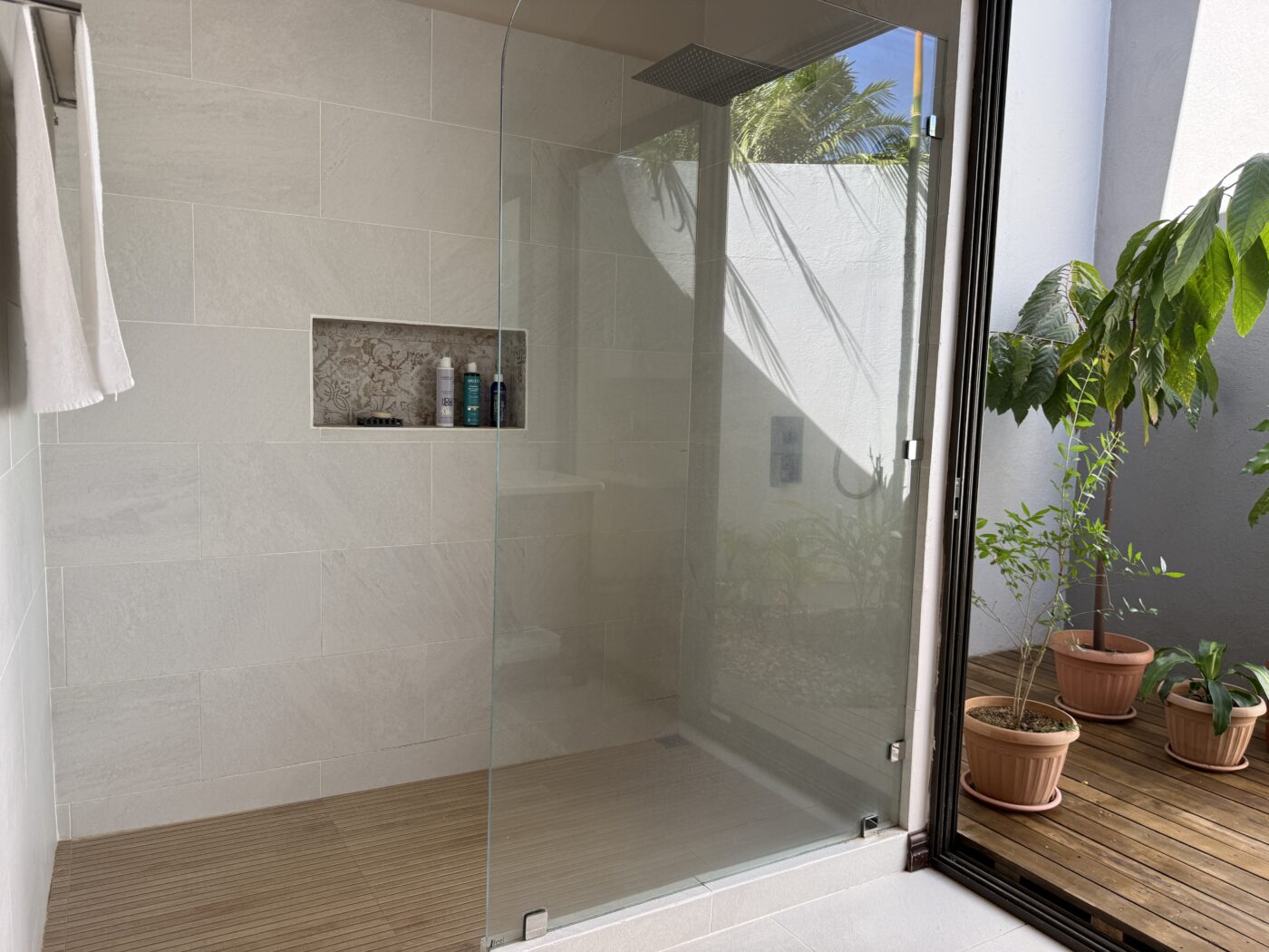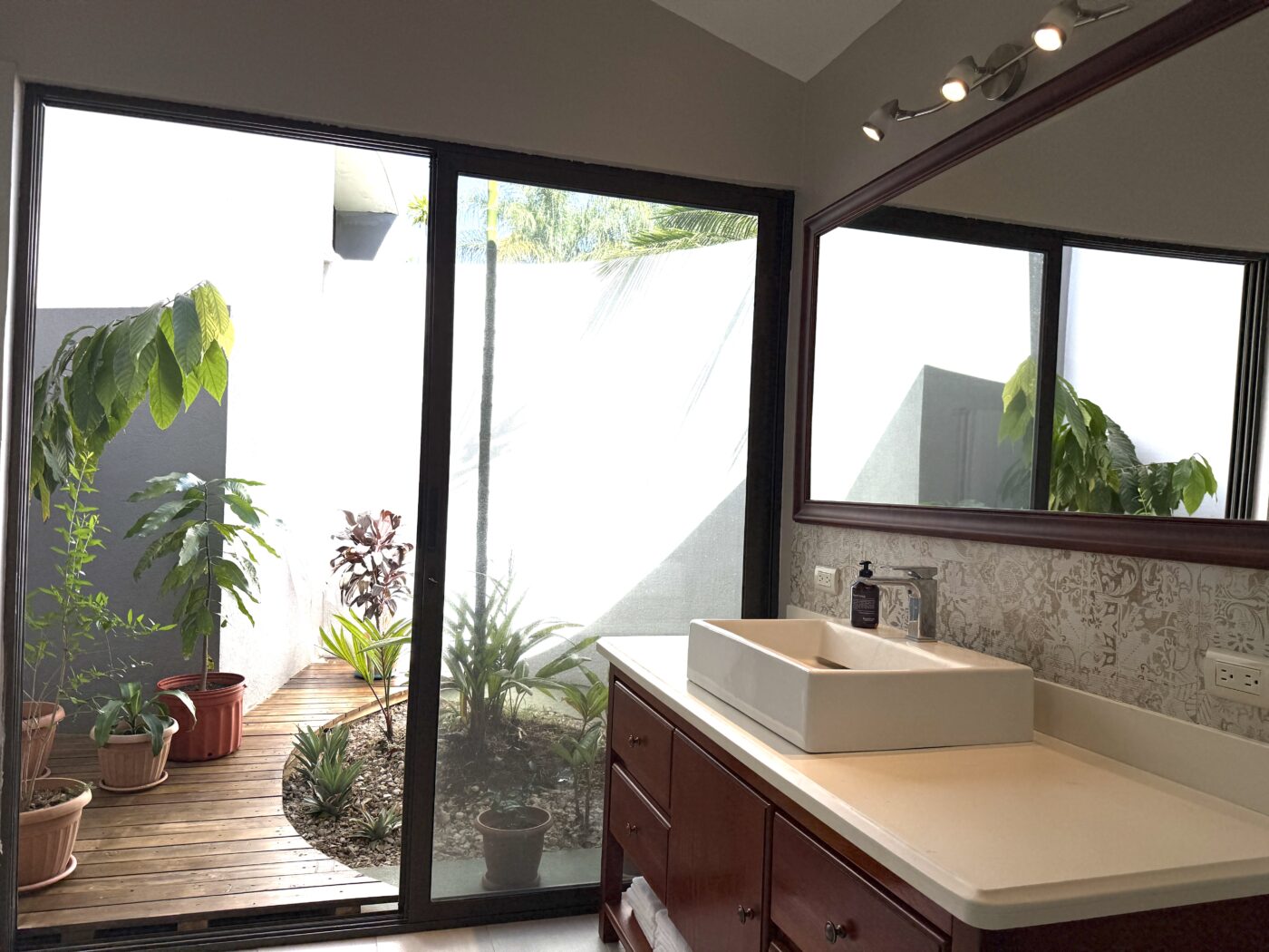 The guest bedroom has a large walk in closet and an en suite bathroom. It is spacious and fresh. The main bedroom has its’ own desk area and private bathroom. There is also a larger walk in closet in the main suite and a luxurious bathroom. There is an interior garden off of this bathroom giving it a spa feel.