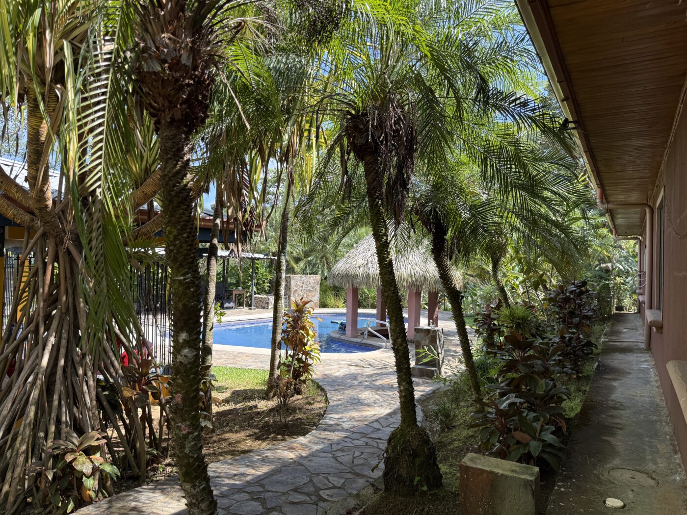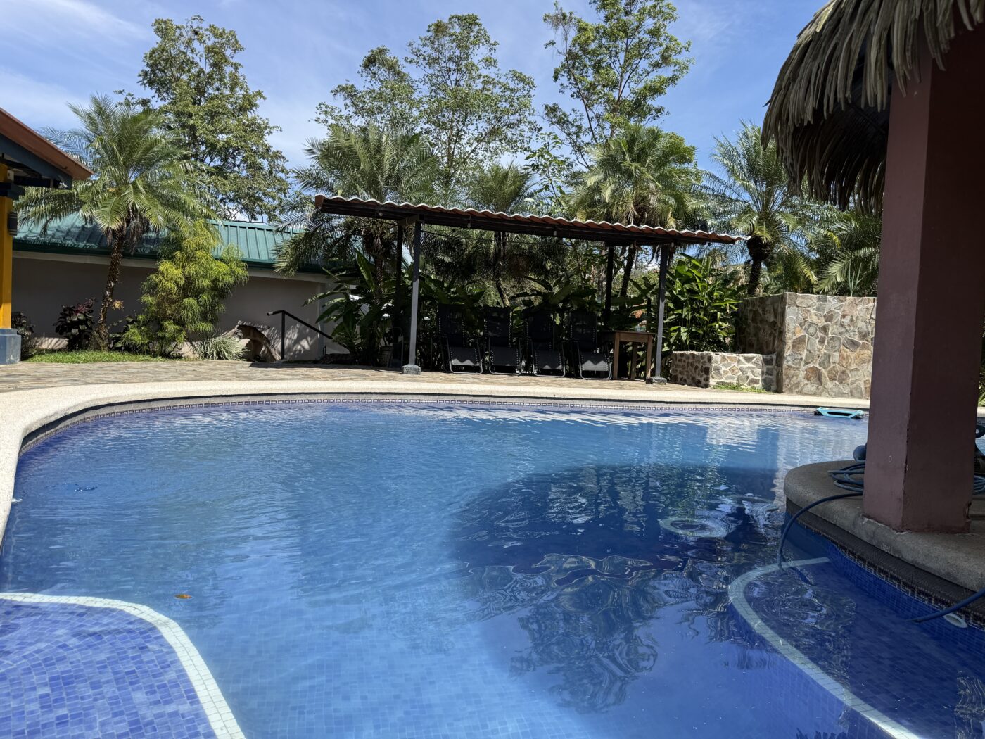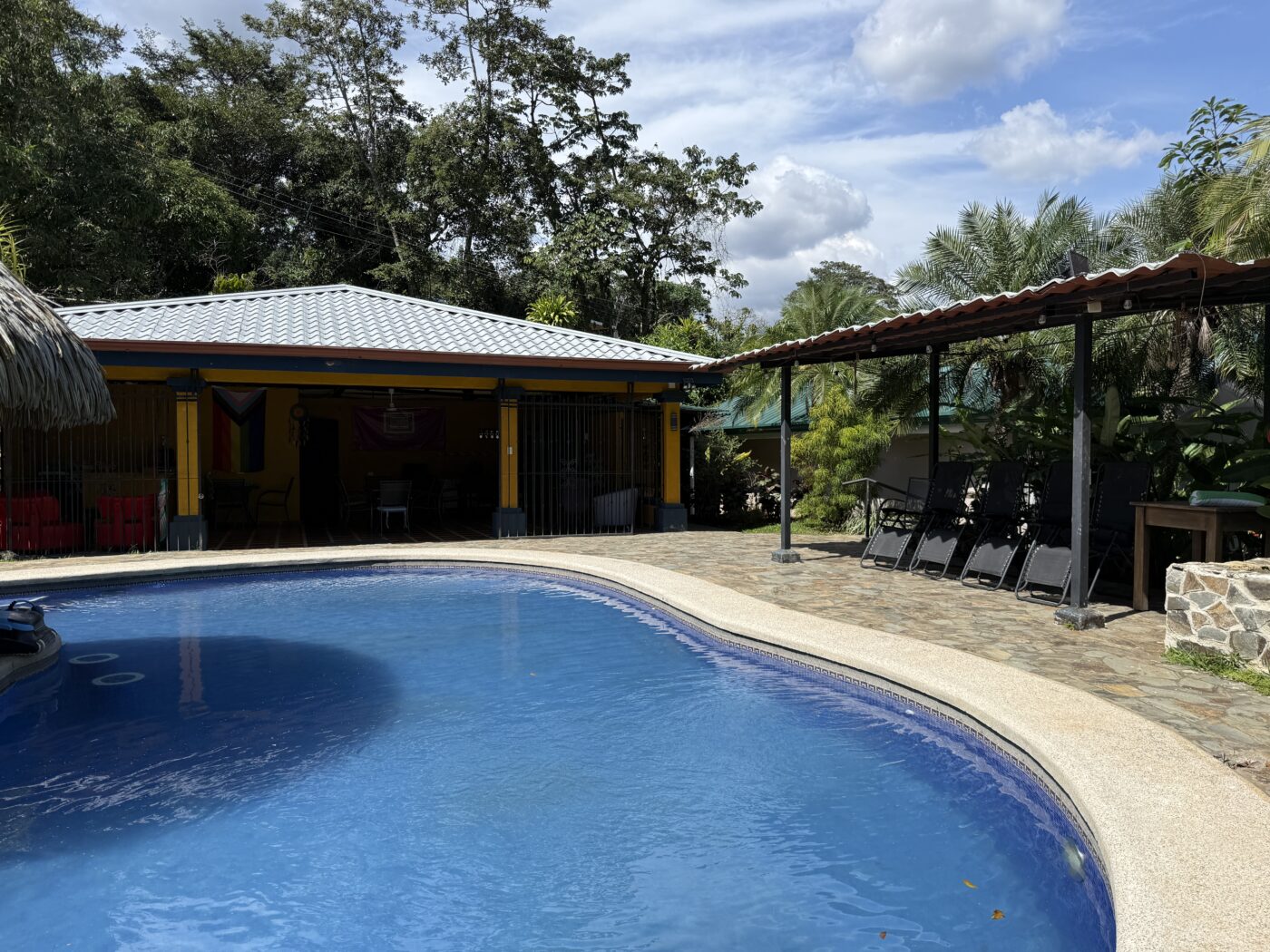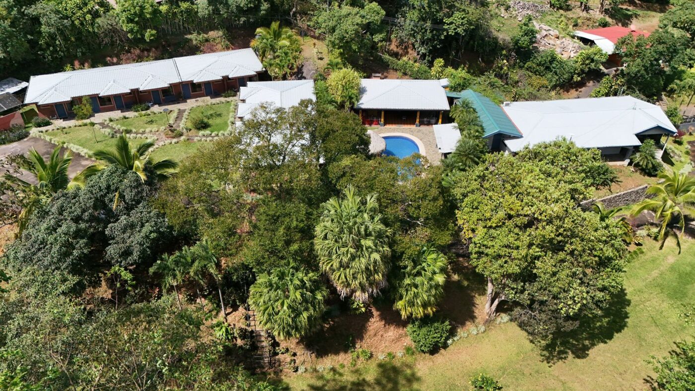 Let’s start with the 9 furnished cabins, each has its own little porch and bathroom. All are fully furnished and ready to be rented out. They all focus on the pretty Spanish-style fountain in the middle of the gardens. From the cabins, you can choose to meander down to the waterfall through the lush tropical gardens or hang out at the pool area, where there is a communal kitchen and covered rancho area. There is a storage area here as well as a tool room.