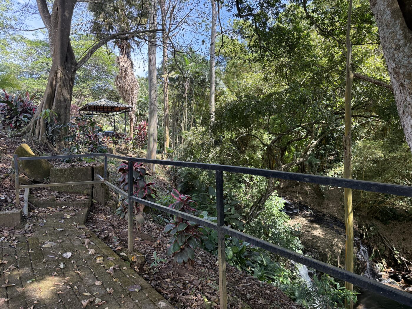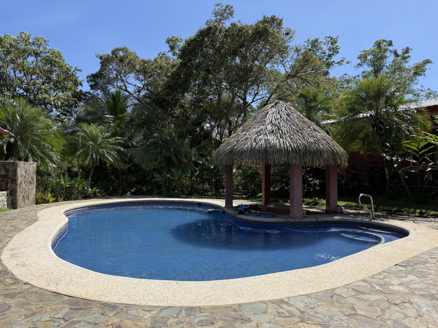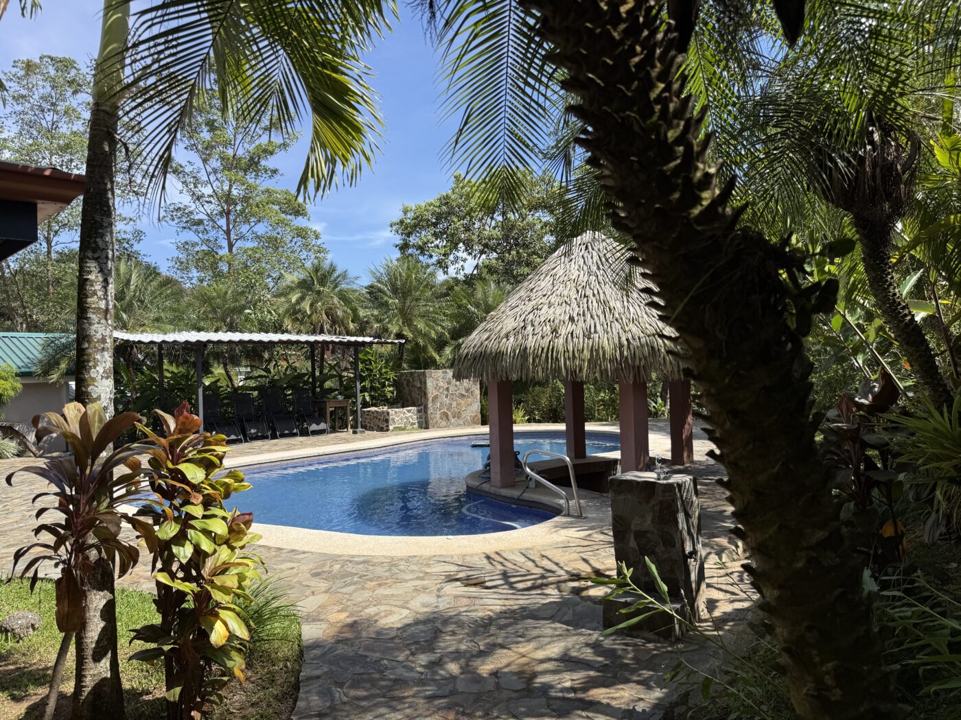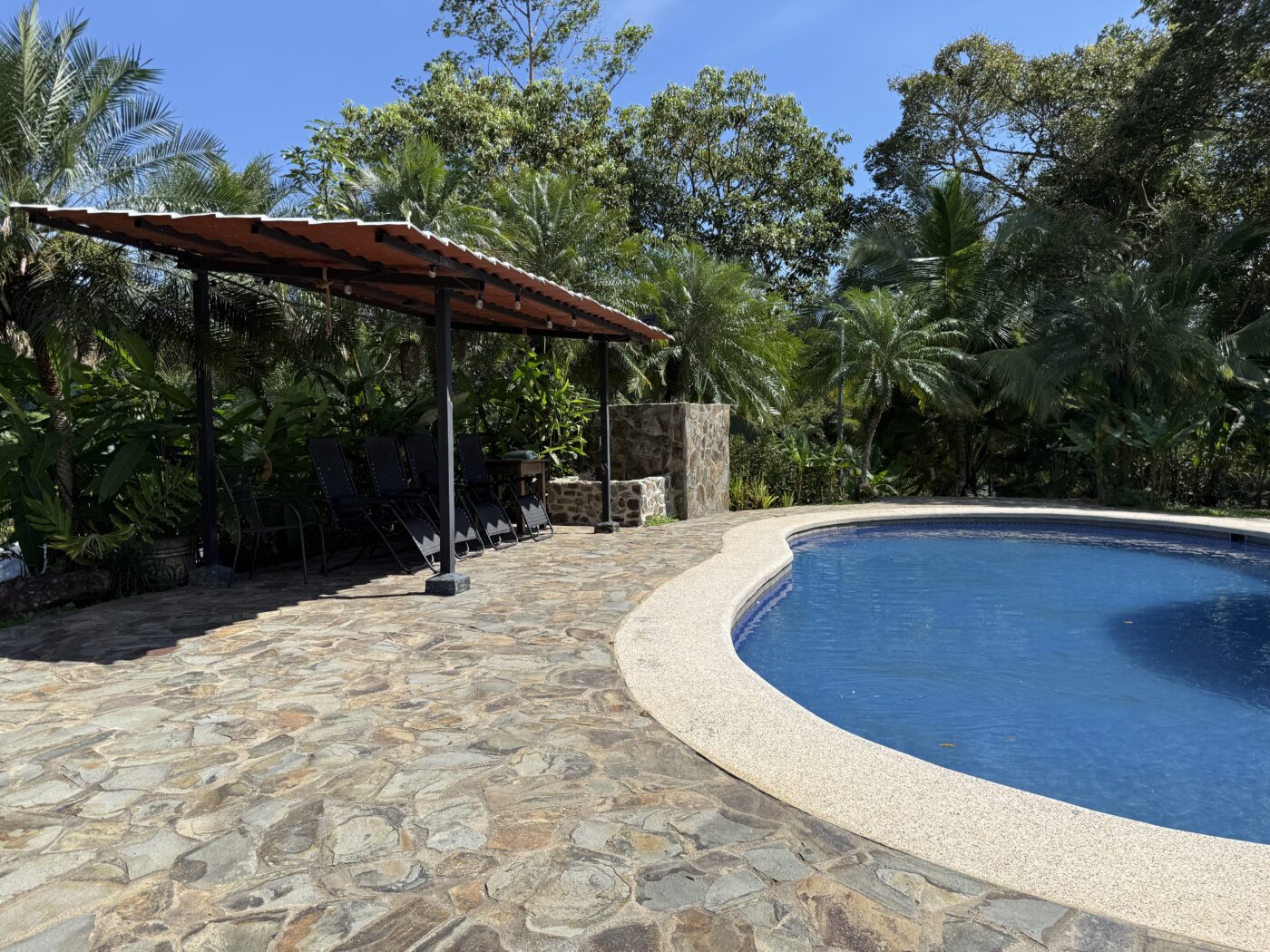 Let’s start with the 9 furnished cabins, each has its own little porch and bathroom. All are fully furnished and ready to be rented out. They all focus on the pretty Spanish-style fountain in the middle of the gardens. From the cabins, you can choose to meander down to the waterfall through the lush tropical gardens or hang out at the pool area, where there is a communal kitchen and covered rancho area. There is a storage area here as well as a tool room.