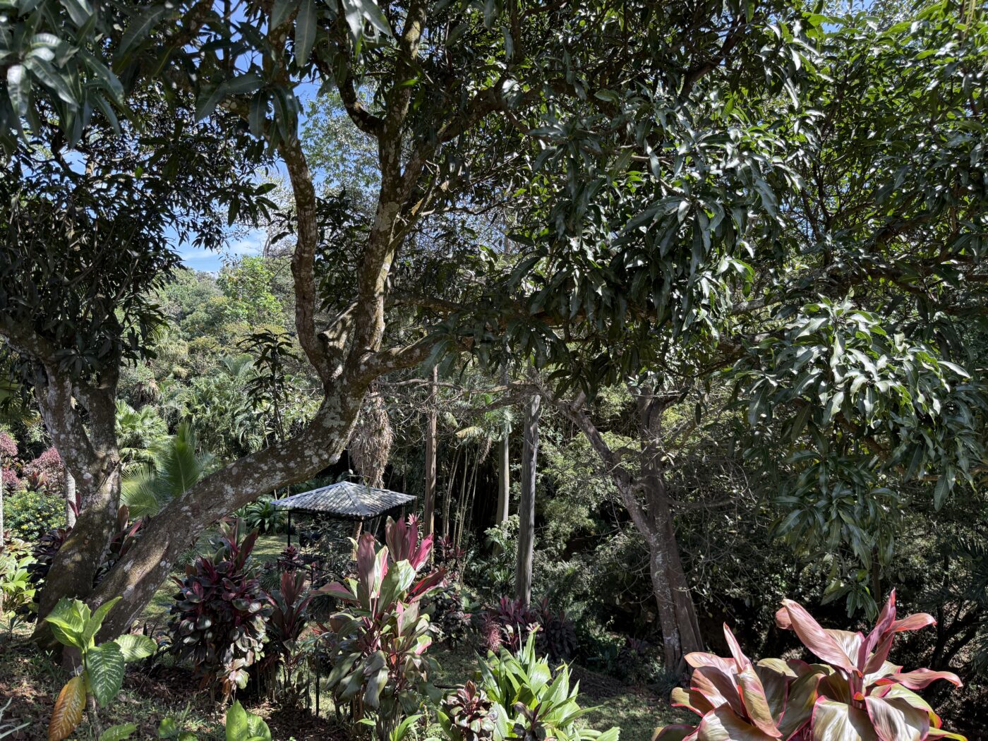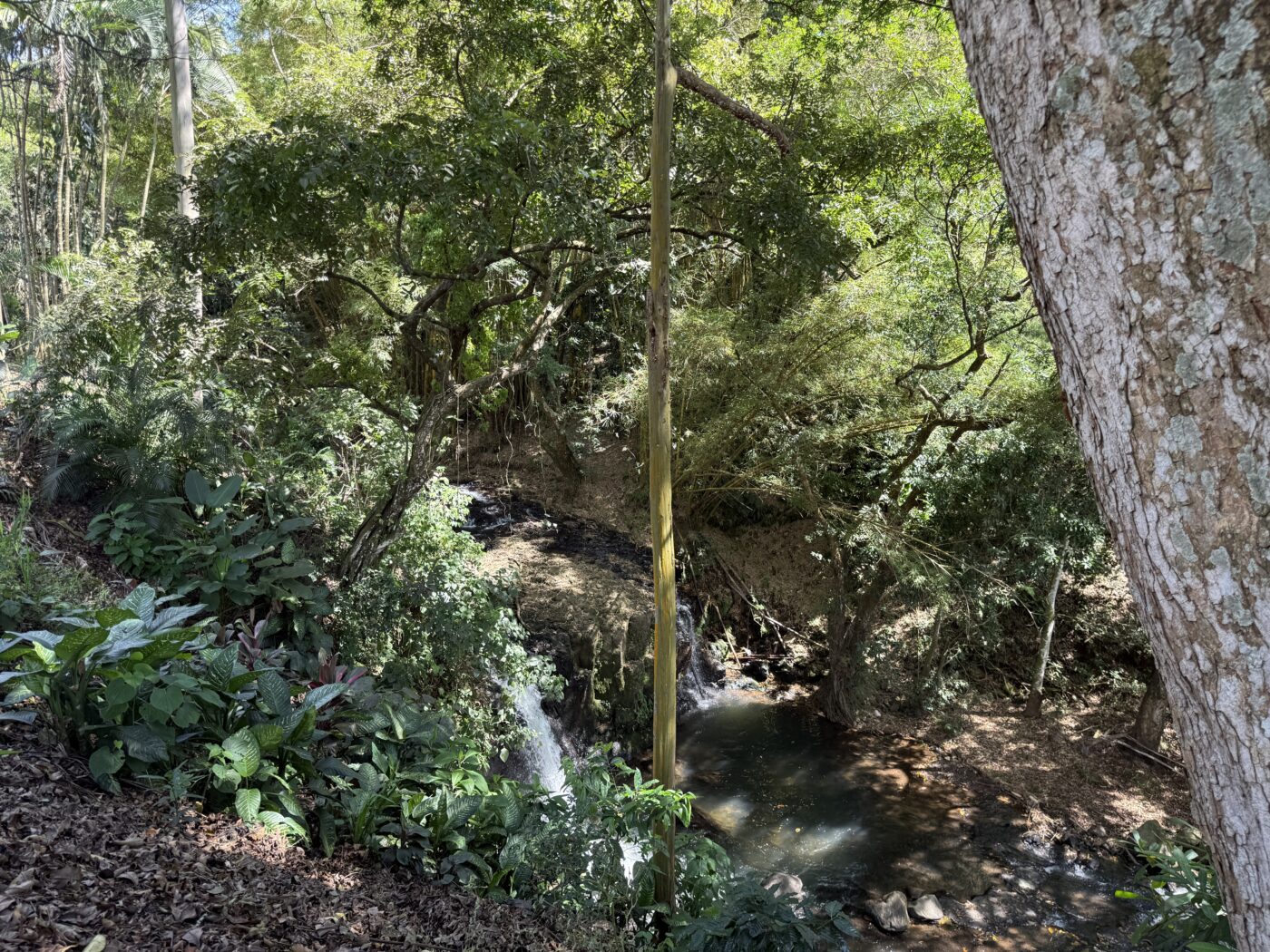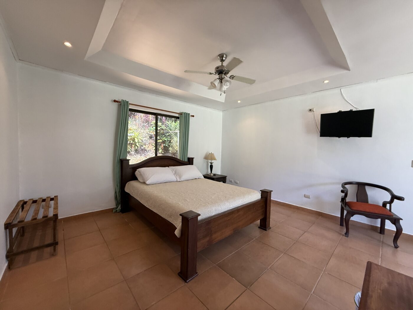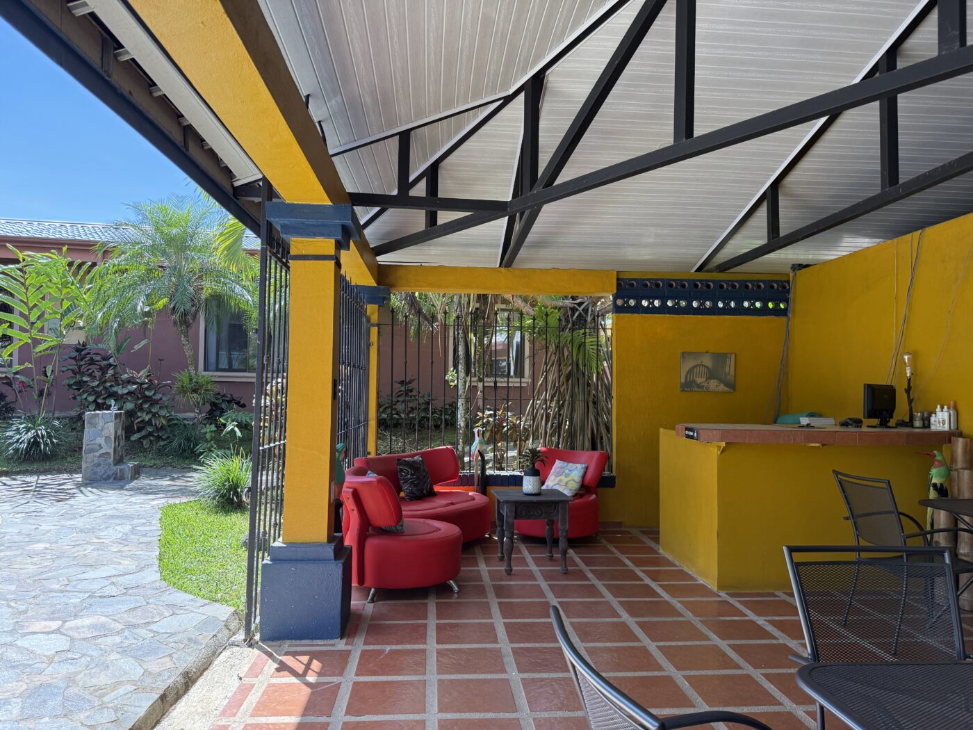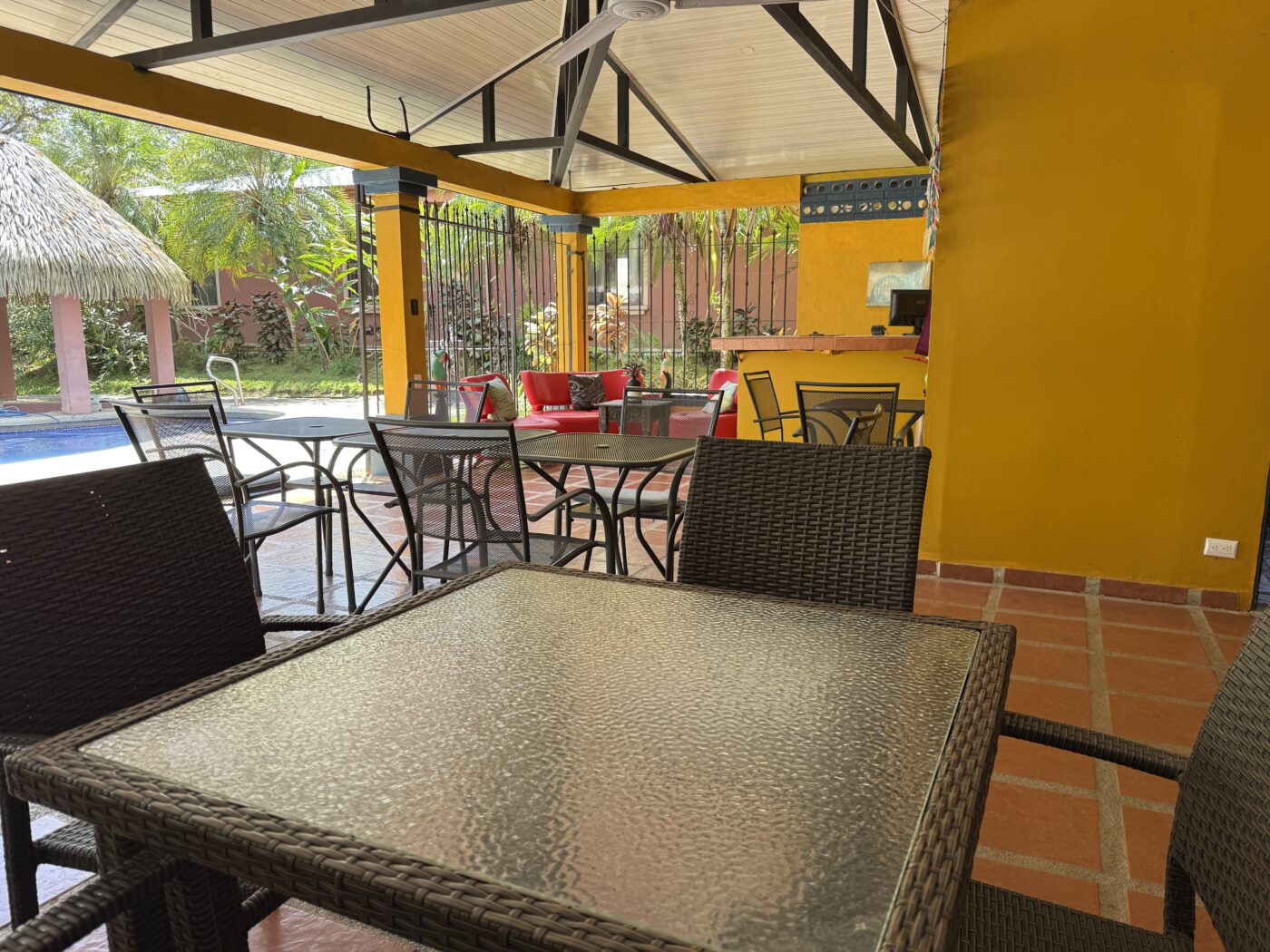 Let’s start with the 9 furnished cabins, each has its own little porch and bathroom. All are fully furnished and ready to be rented out. They all focus on the pretty Spanish-style fountain in the middle of the gardens. From the cabins, you can choose to meander down to the waterfall through the lush tropical gardens or hang out at the pool area, where there is a communal kitchen and covered rancho area. There is a storage area here as well as a tool room.