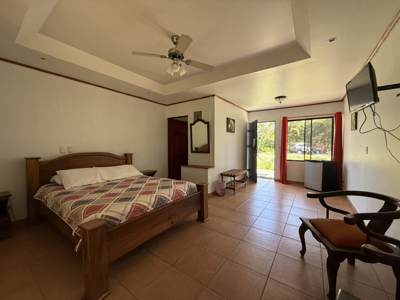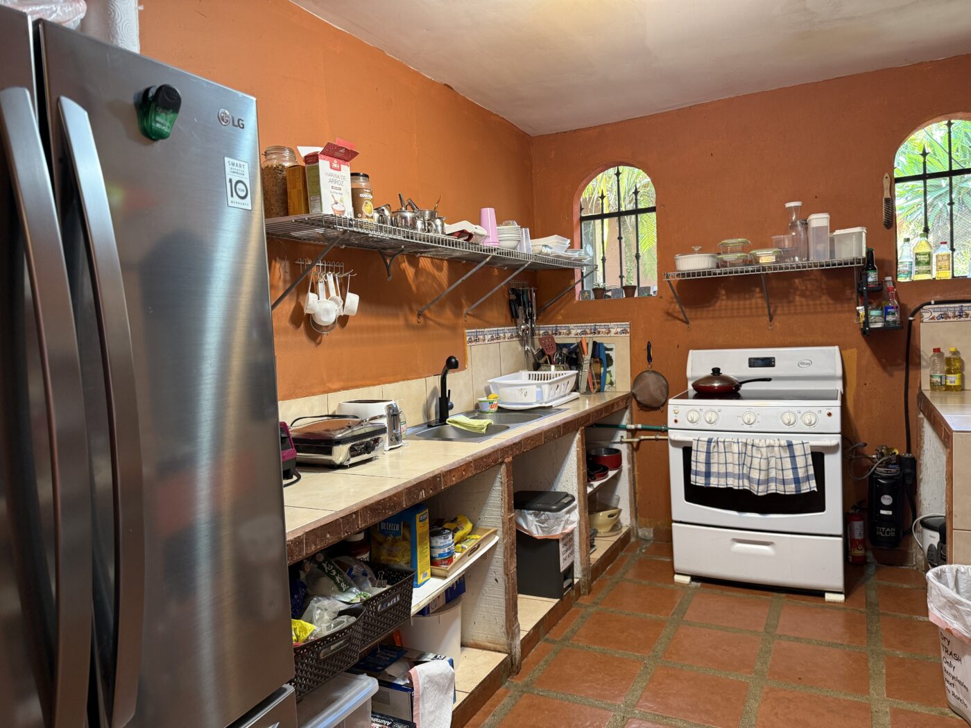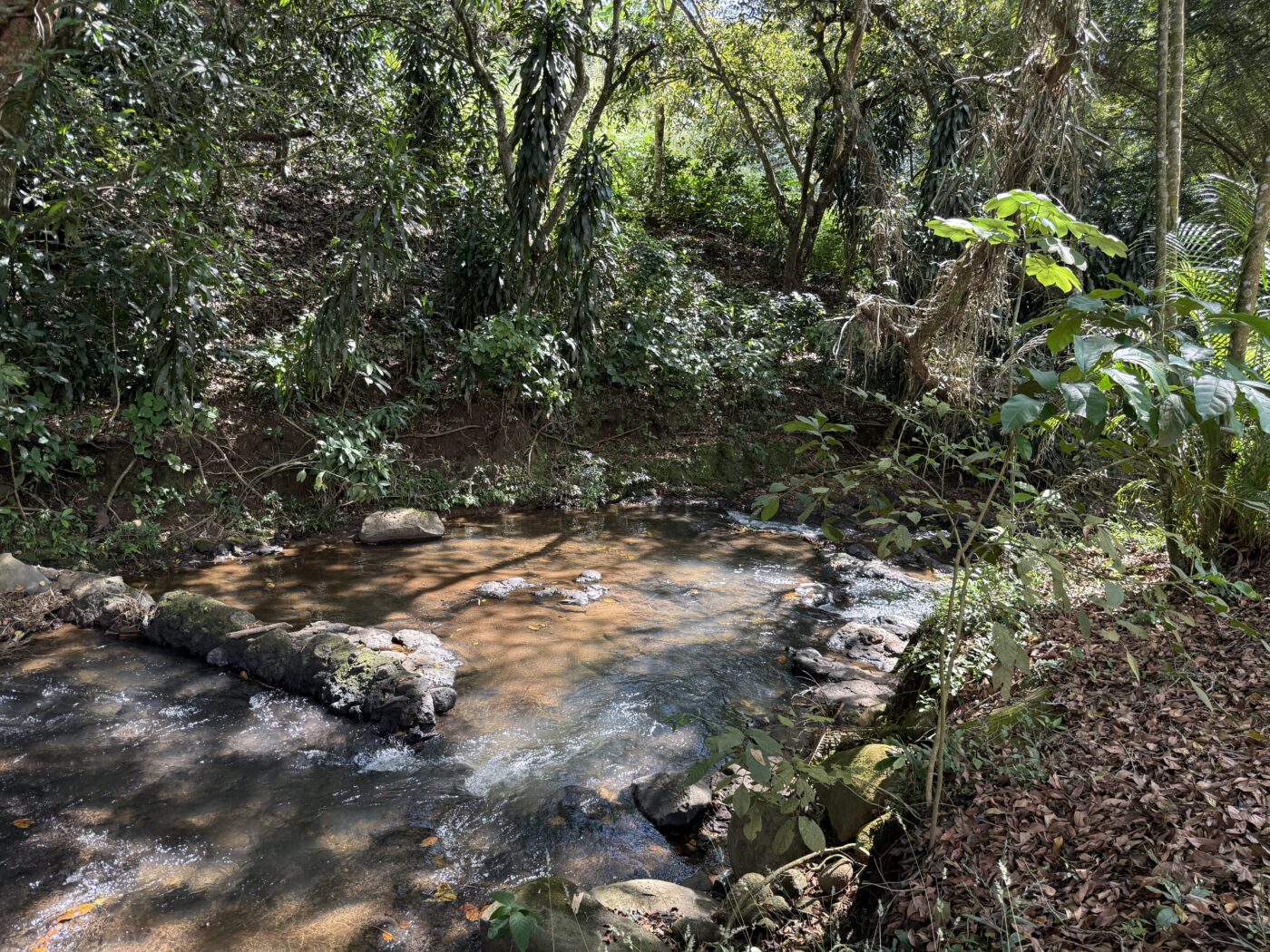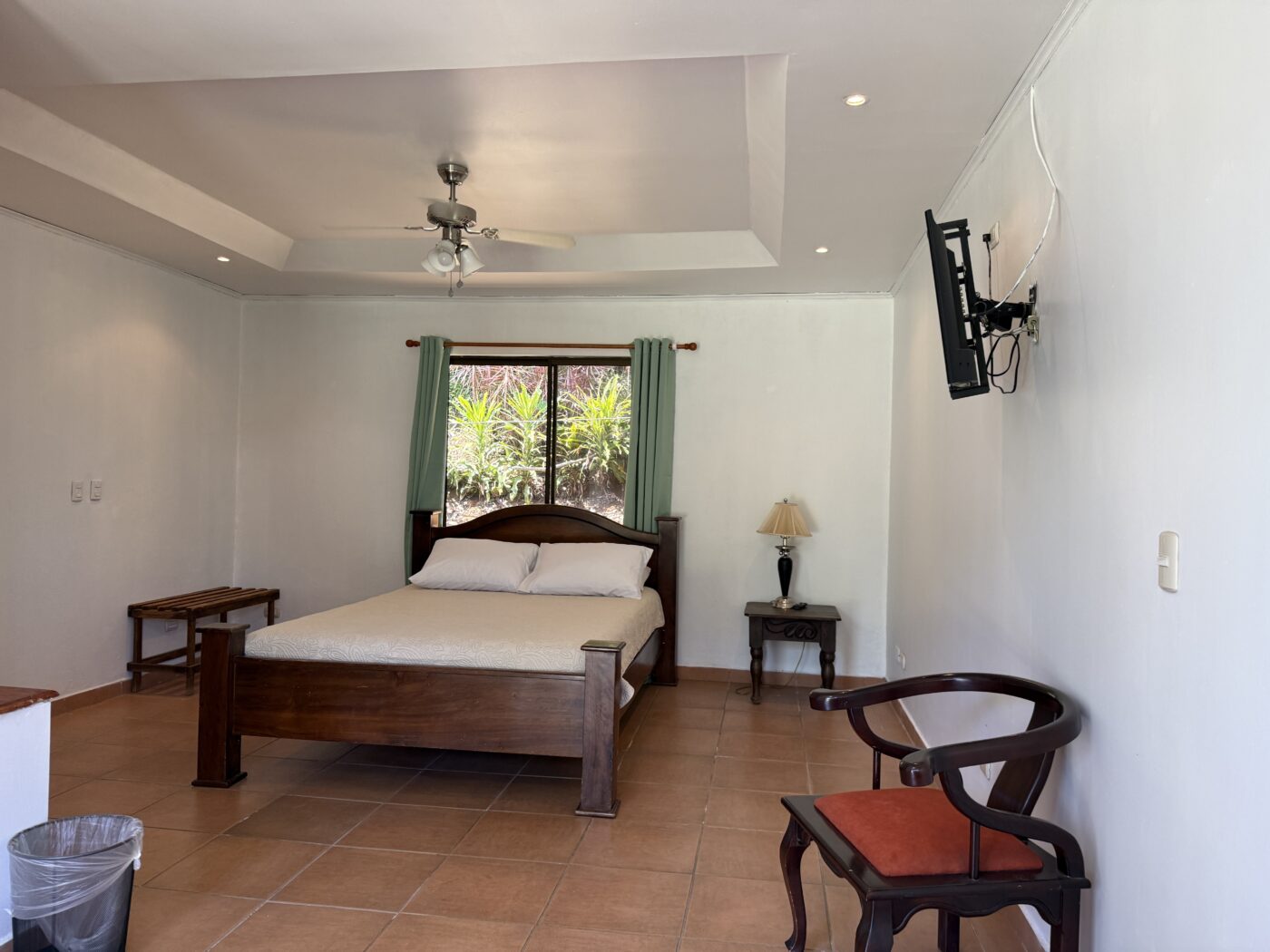 Let’s start with the 9 furnished cabins, each has its own little porch and bathroom. All are fully furnished and ready to be rented out. They all focus on the pretty Spanish-style fountain in the middle of the gardens. From the cabins, you can choose to meander down to the waterfall through the lush tropical gardens or hang out at the pool area, where there is a communal kitchen and covered rancho area. There is a storage area here as well as a tool room.