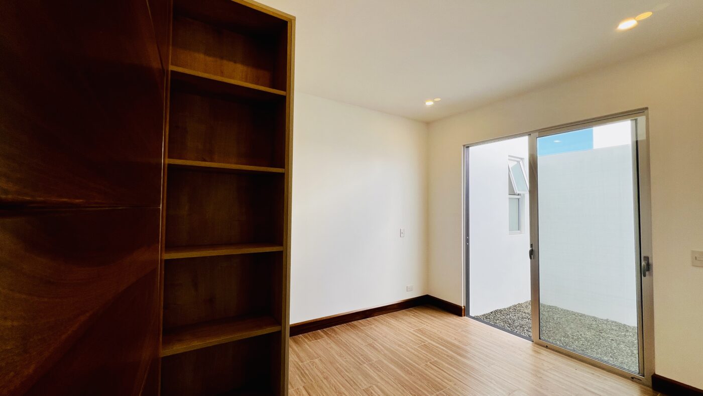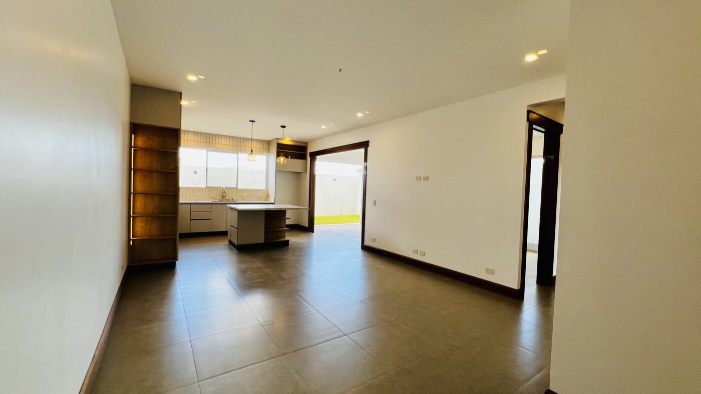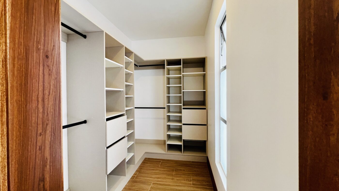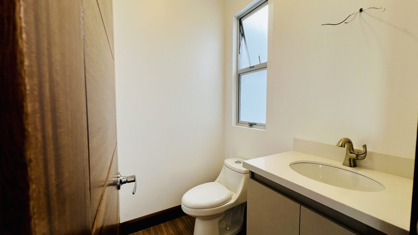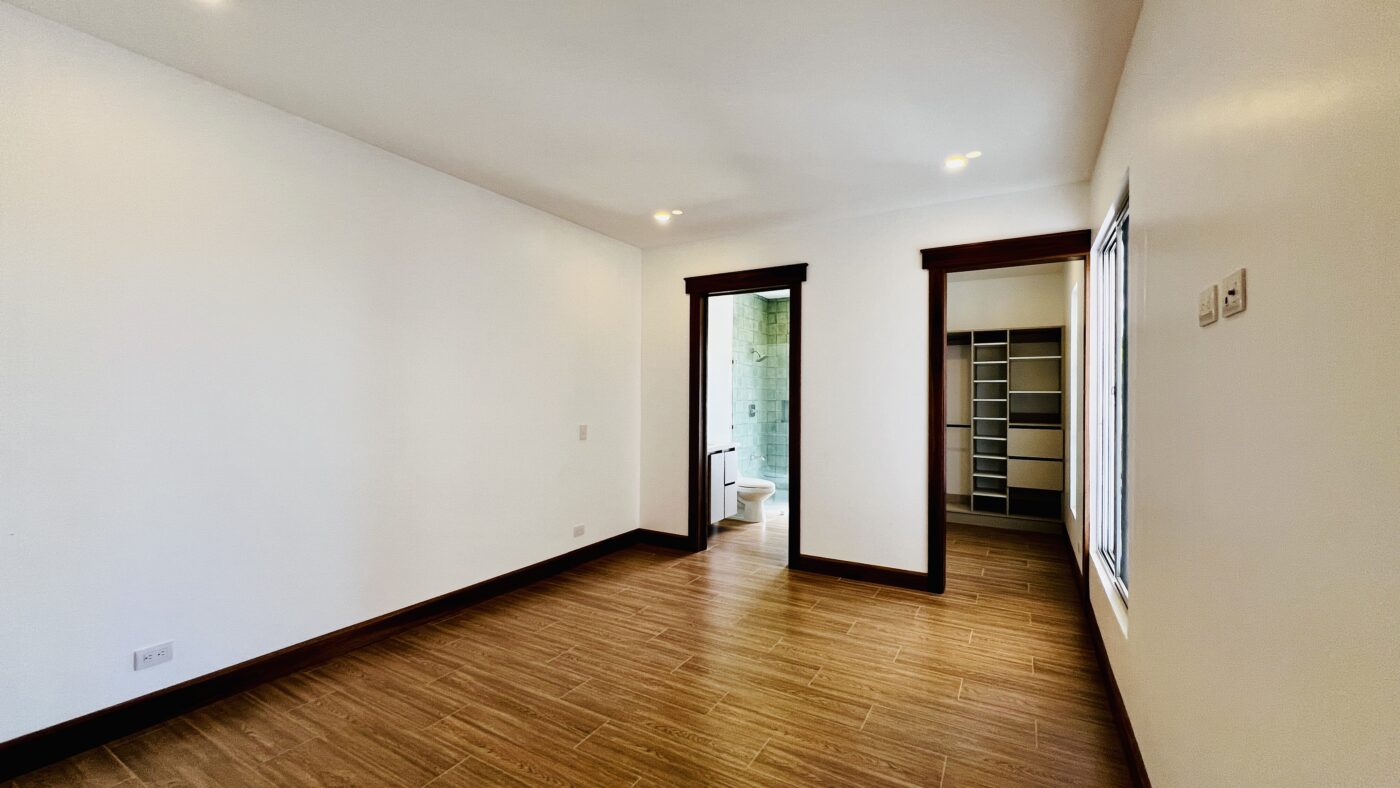 La propiedad ofrece tres habitaciones con closets, dos baños completos y medio baño para visitas. El dormitorio principal cuenta con walk-in closet y baño privado con cerámica moderna y acabados contemporáneos.