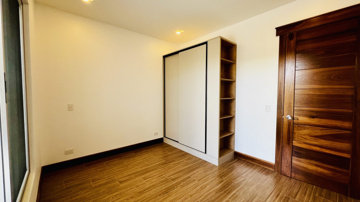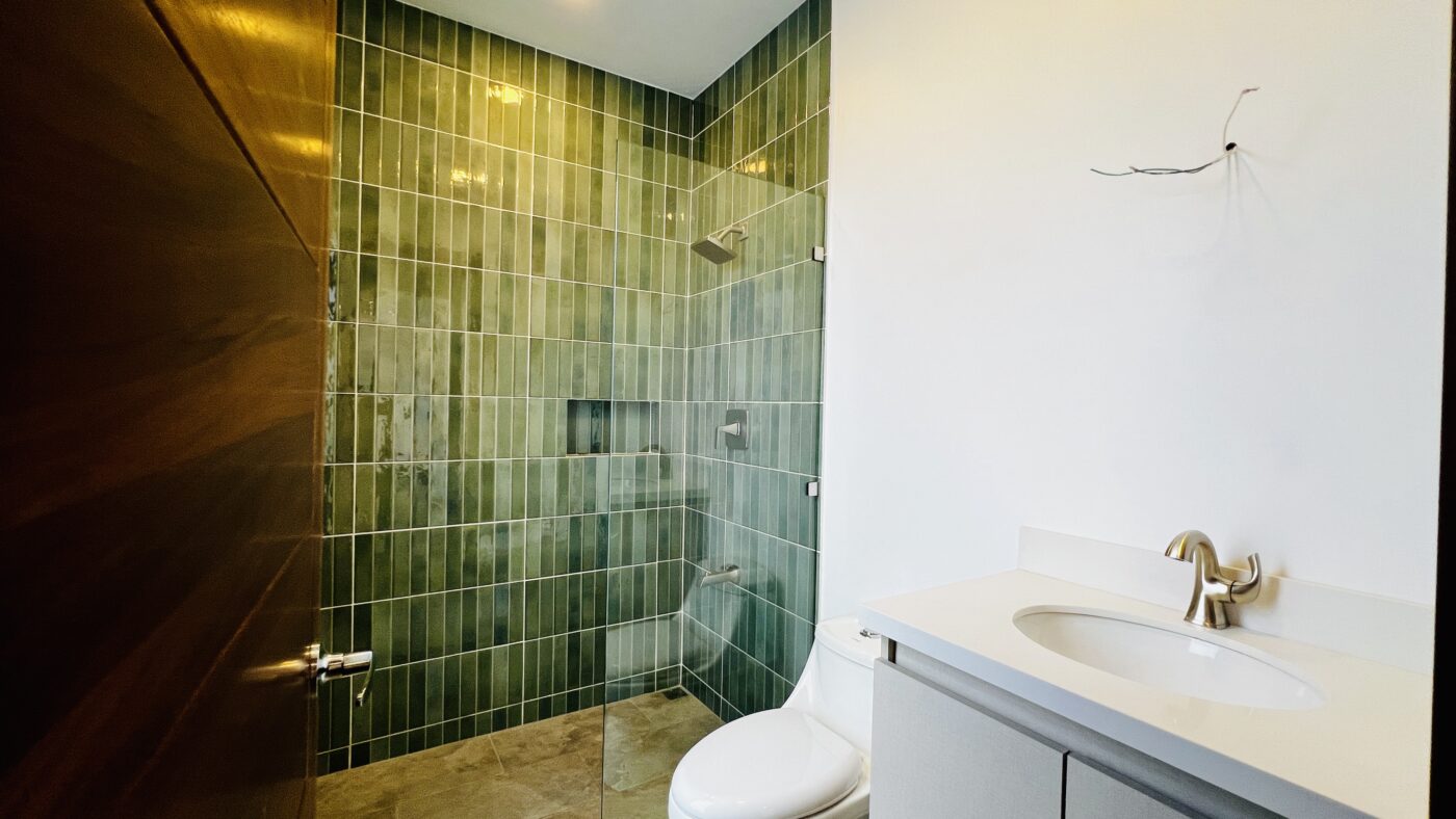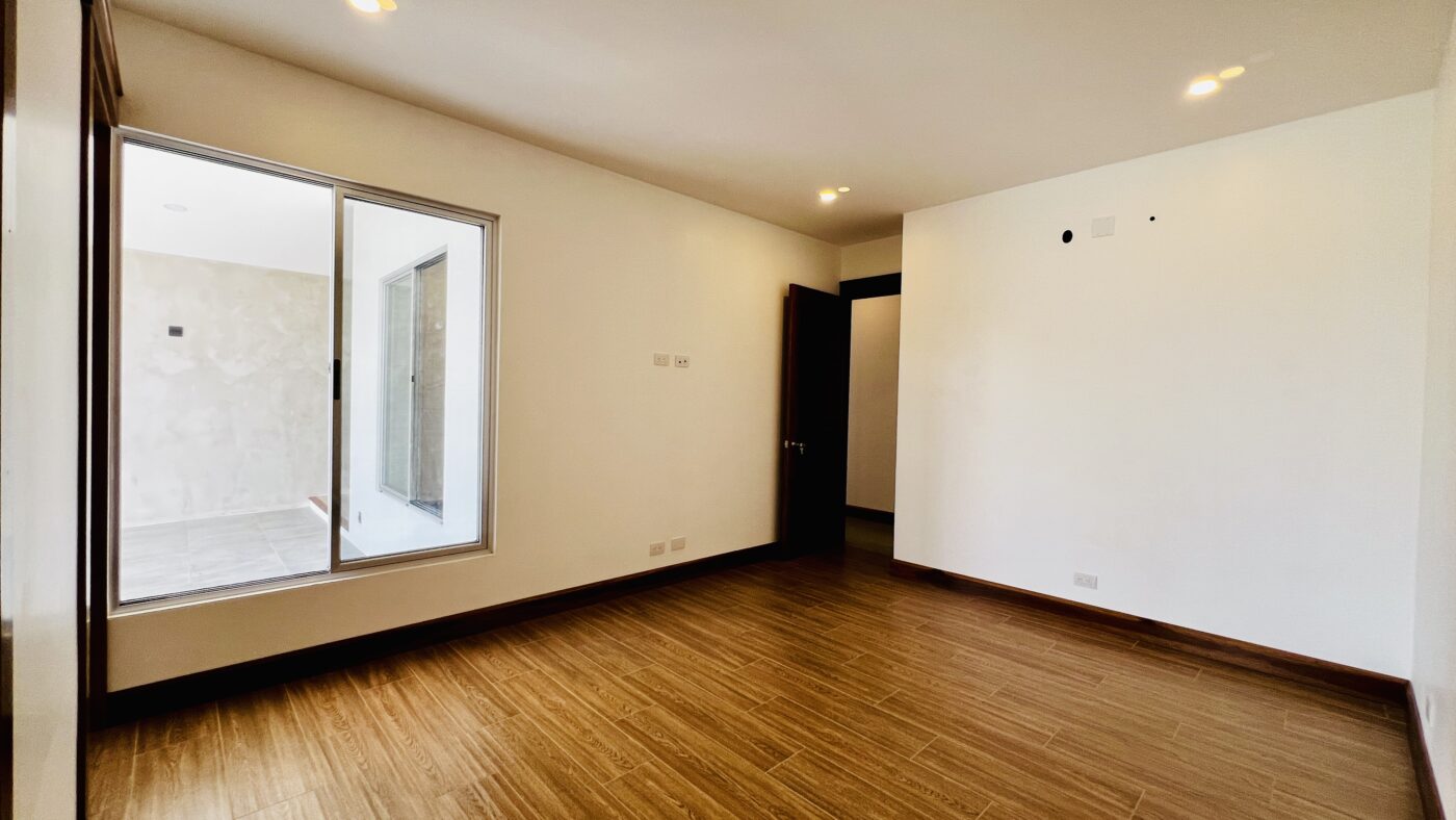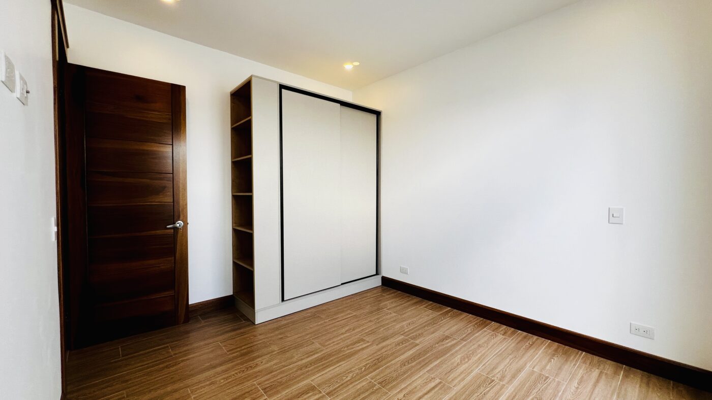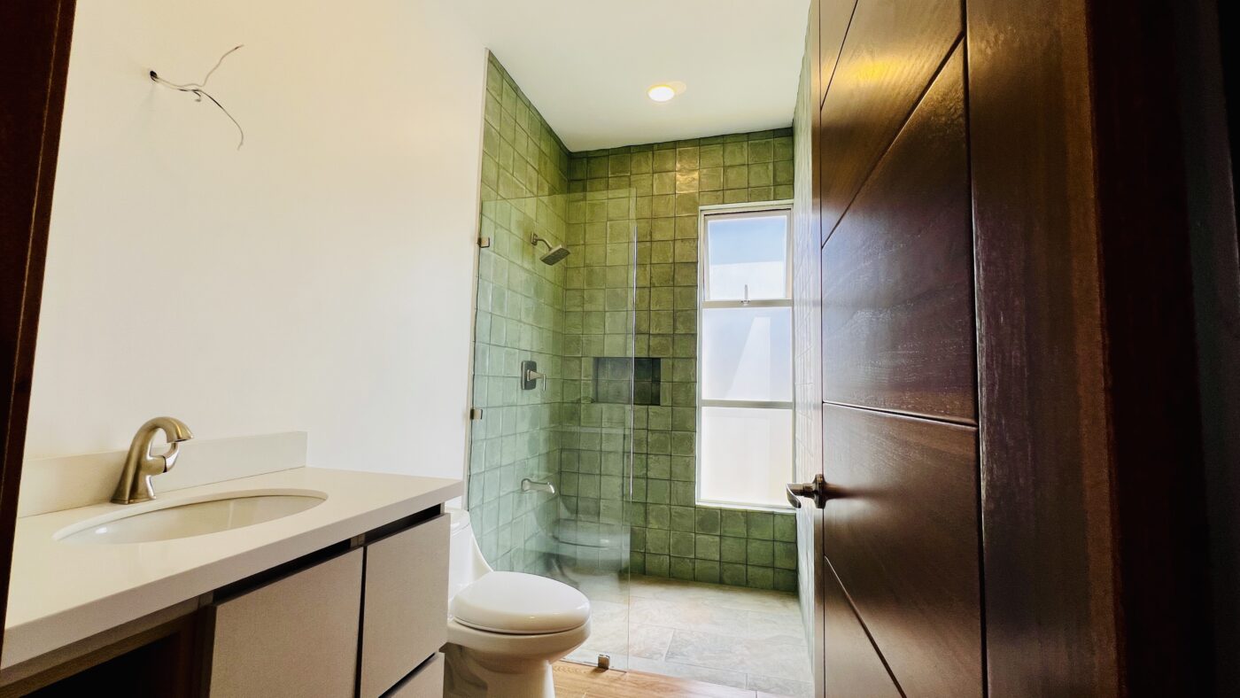 La propiedad ofrece tres habitaciones con closets, dos baños completos y medio baño para visitas. El dormitorio principal cuenta con walk-in closet y baño privado con cerámica moderna y acabados contemporáneos.