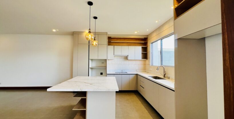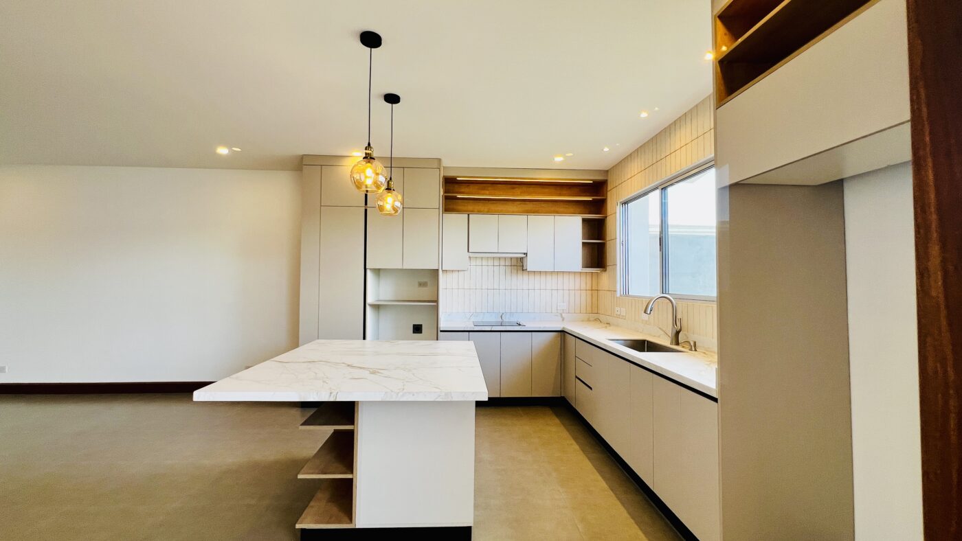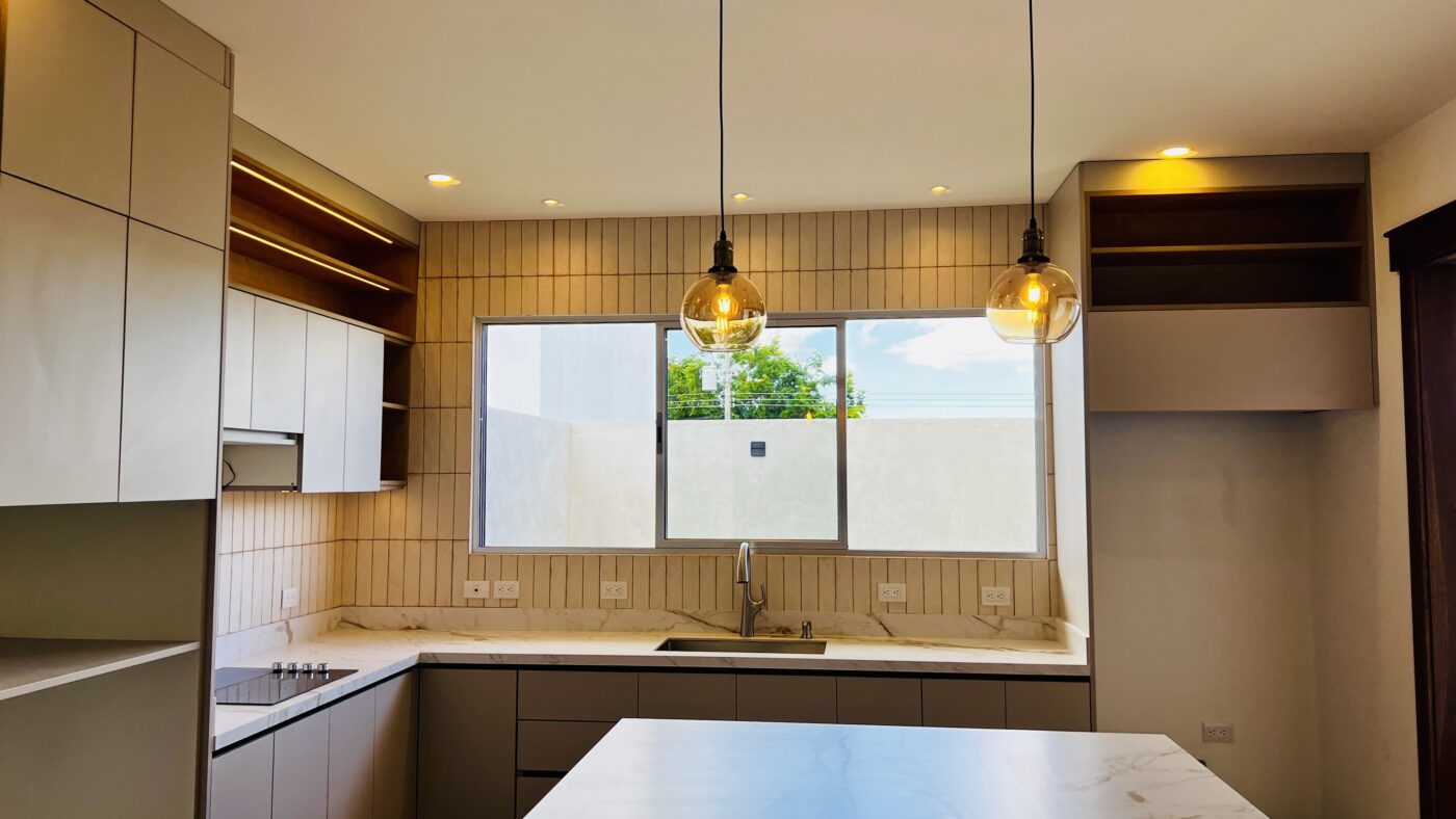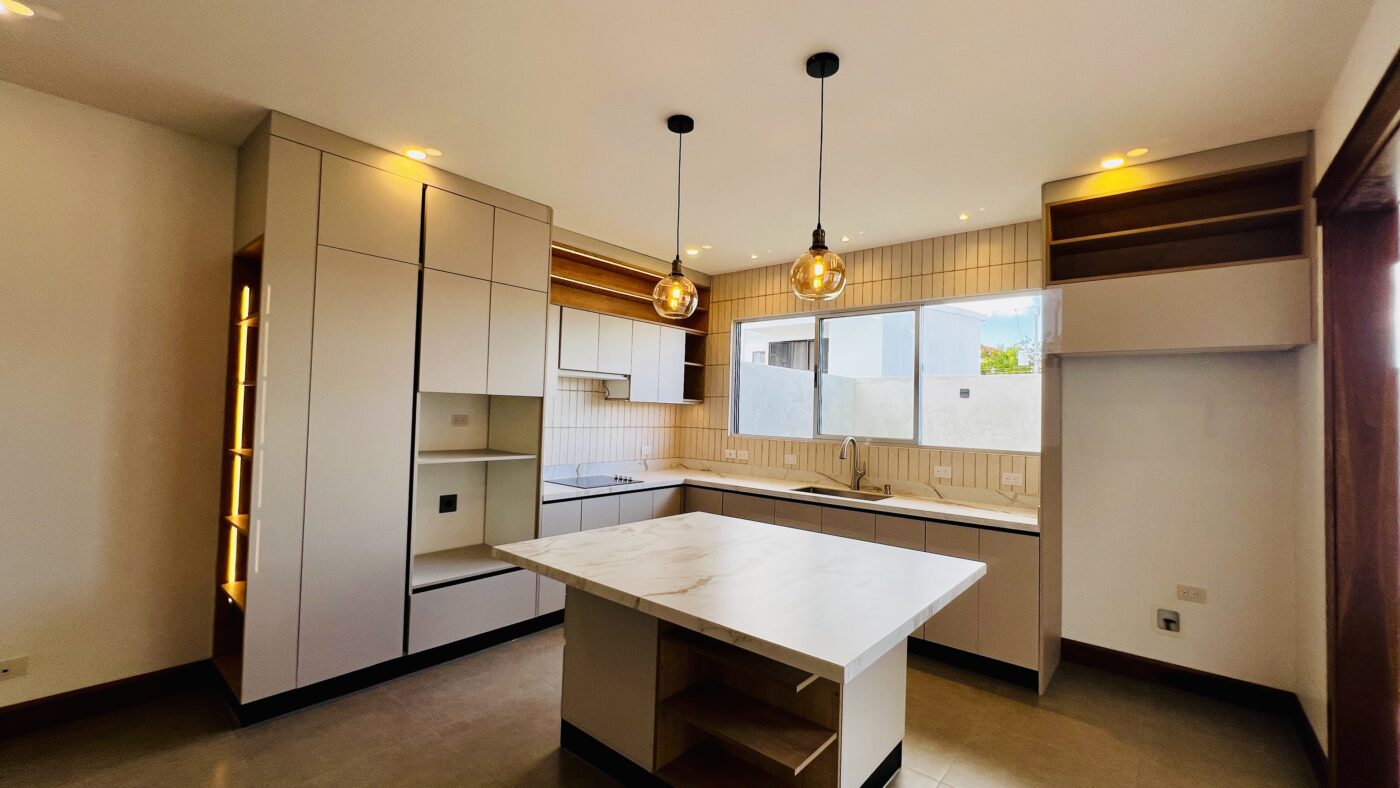 El área social ofrece un concepto abierto de sala, comedor y cocina, creando un espacio amplio y funcional. La cocina cuenta con una amplia isla con cubierta en porcelánico o piedra sintetizada, y abundantes gabinetes de almacenamiento.
