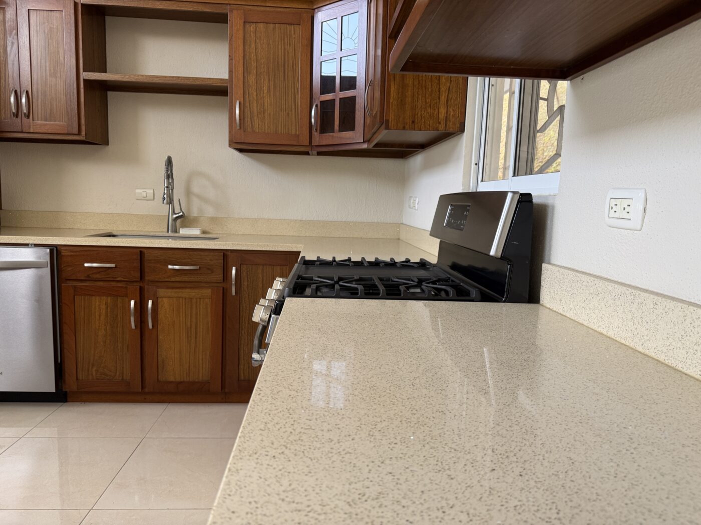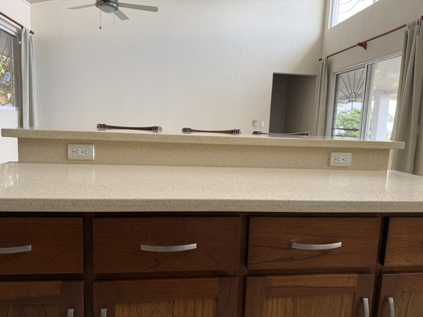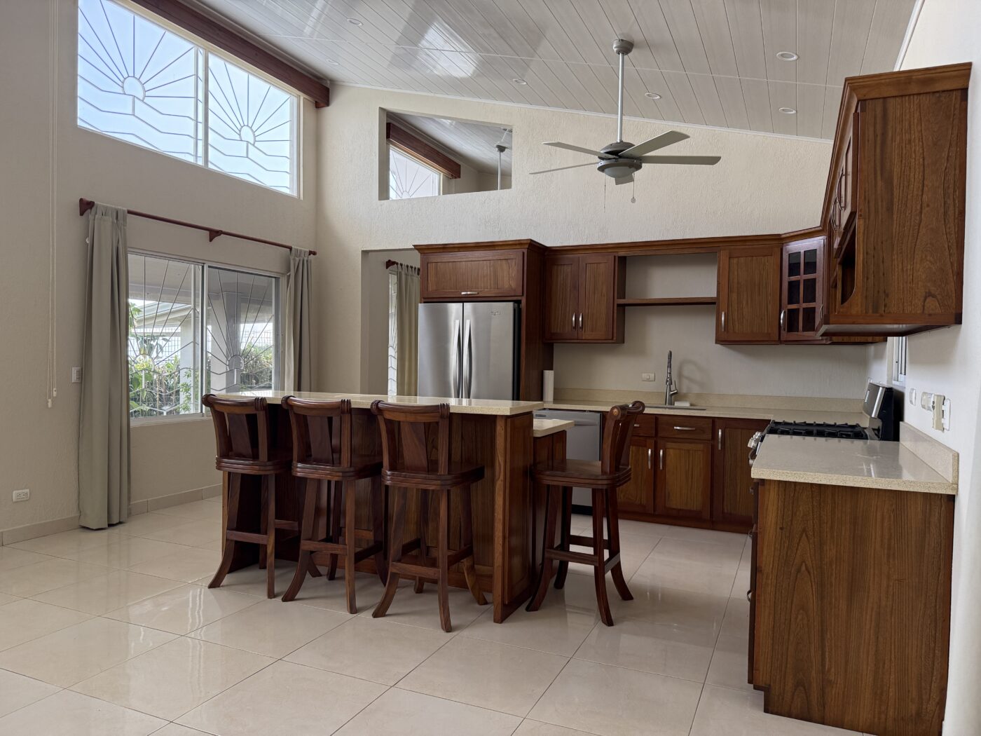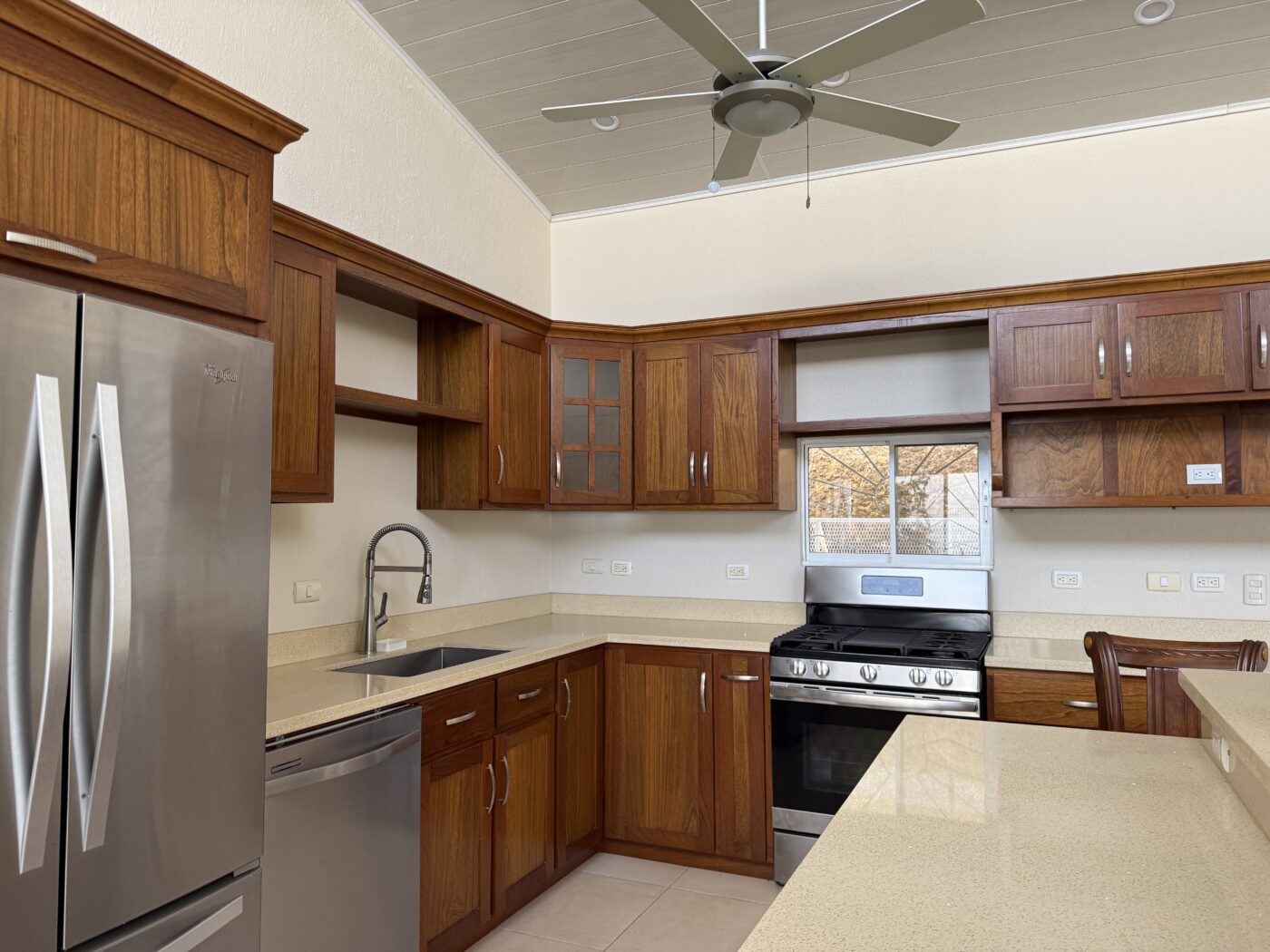 The kitchen has an open design living and kitchen area. With lots of windows this is a nice bright area. The kitchen has hardwood cabinets and beautiful quartz counter tops. There is a ton of counter space and storage in this kitchen. The elevated bar area is perfect for your guests to sit and chat with you while you are cooking.