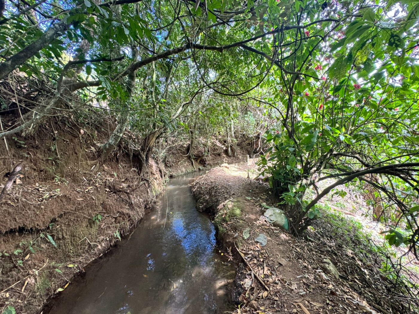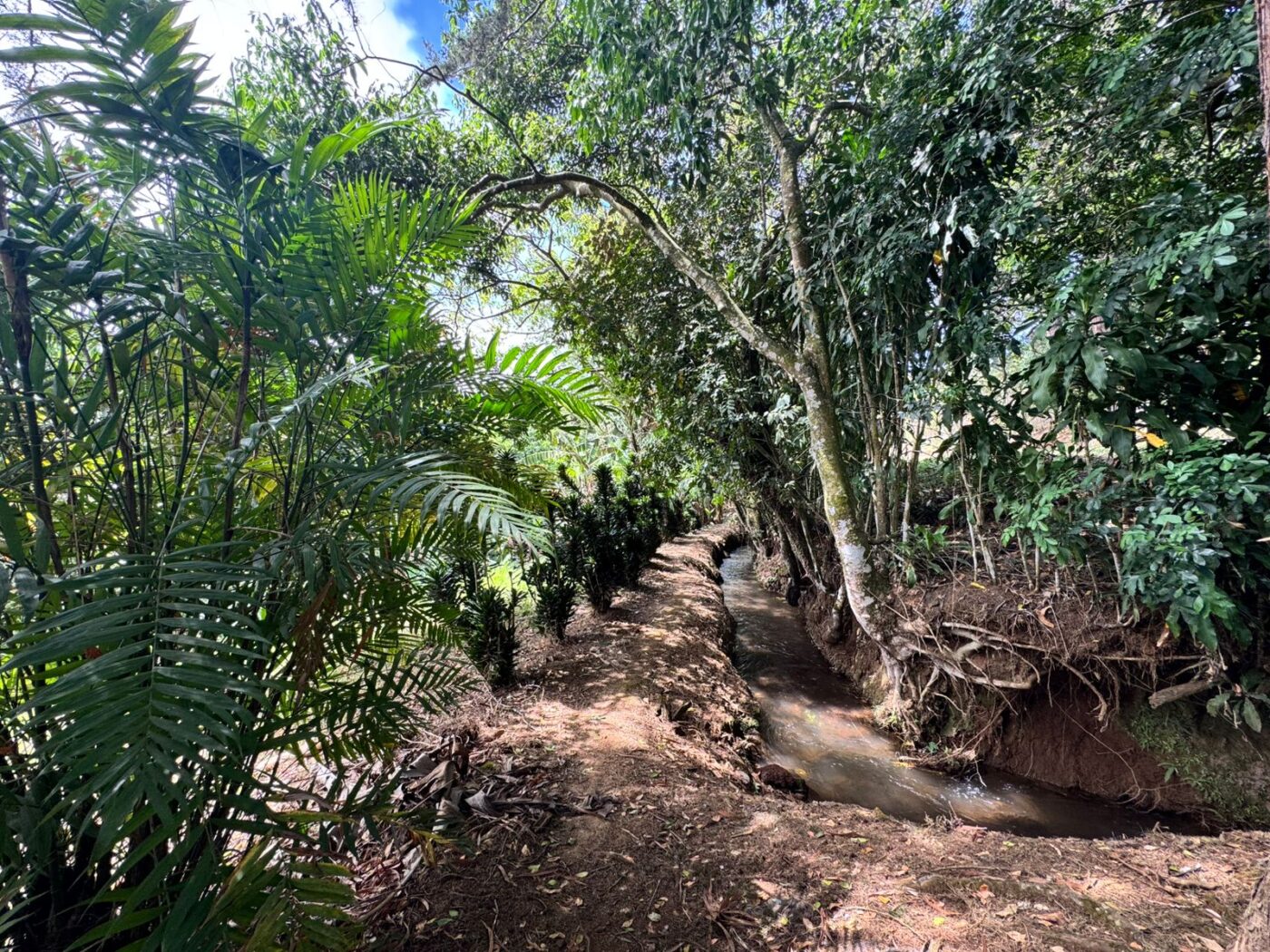 The property features a variety of fruit trees, including avocado and water apple, along with plantain and banana trees, adding natural abundance and charm. A unique highlight is that the land is crossed by an irrigation canal (acequia), a water diversion from a nearby river that provides a constant water flow, ideal for irrigation systems, tilapia ponds, or even koi fish farming.