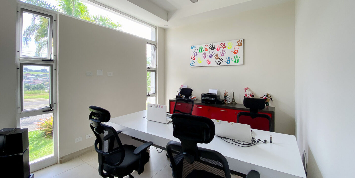 En el primer nivel se encuentra un espacio de oficina, una habitación secundaria, un baño completo, cuarto de pilas amplio y cochera para dos vehículos bajo techo y dos adicionales sin techar. En el segundo nivel, el dormitorio principal ofrece baño completo con doble lavatorio y walk-in closet, acompañado de una habitación adicional con baño privado y walk-in closet. Las escaleras con barandales de vidrio aportan elegancia y amplitud visual.
