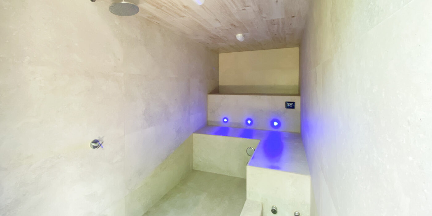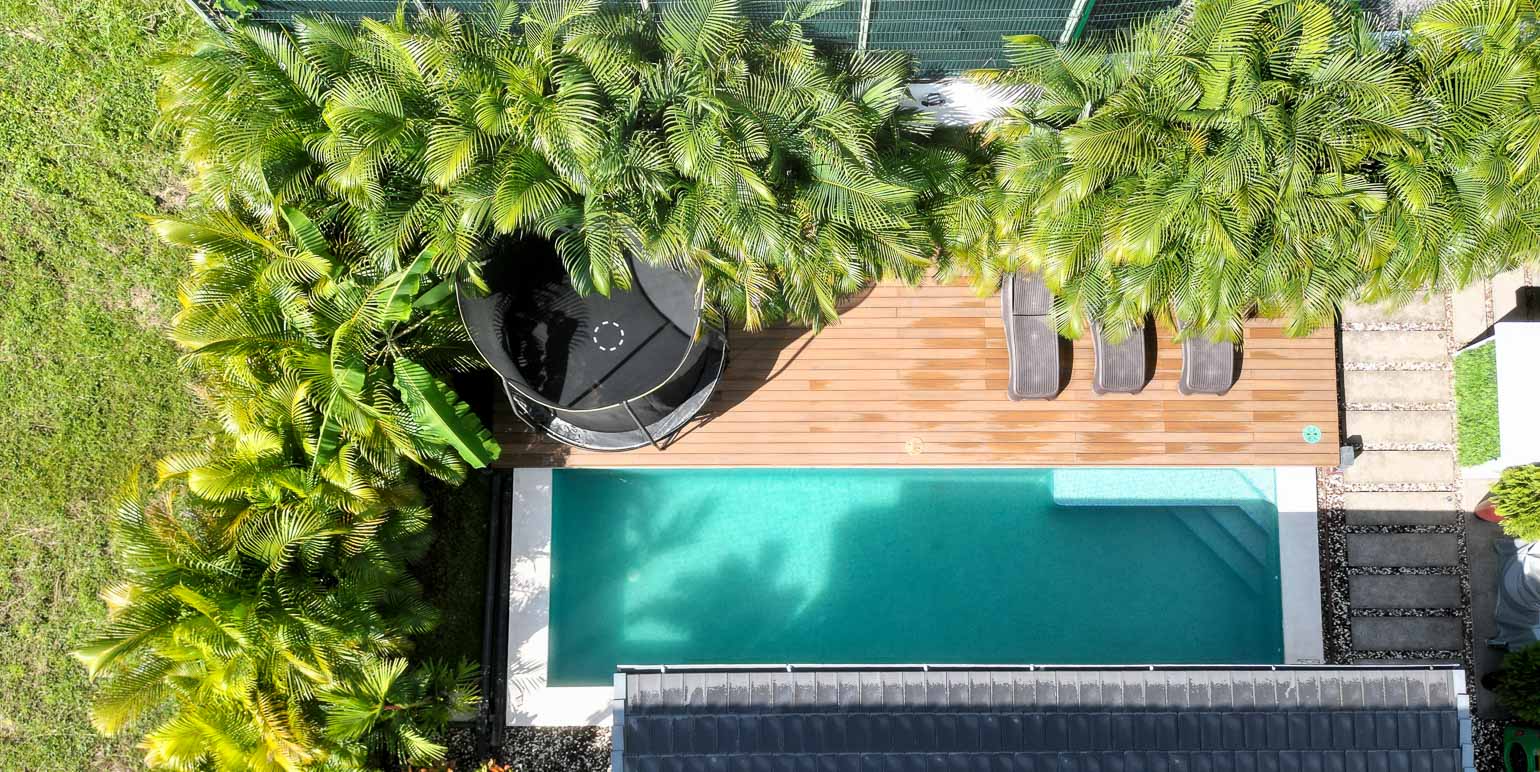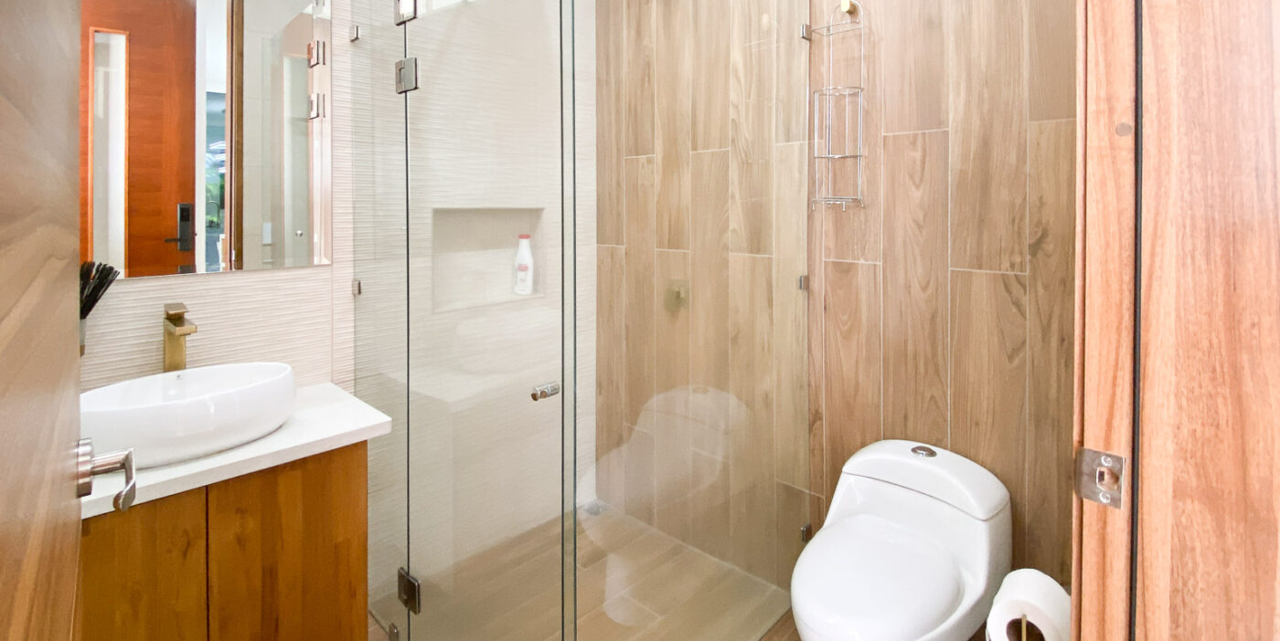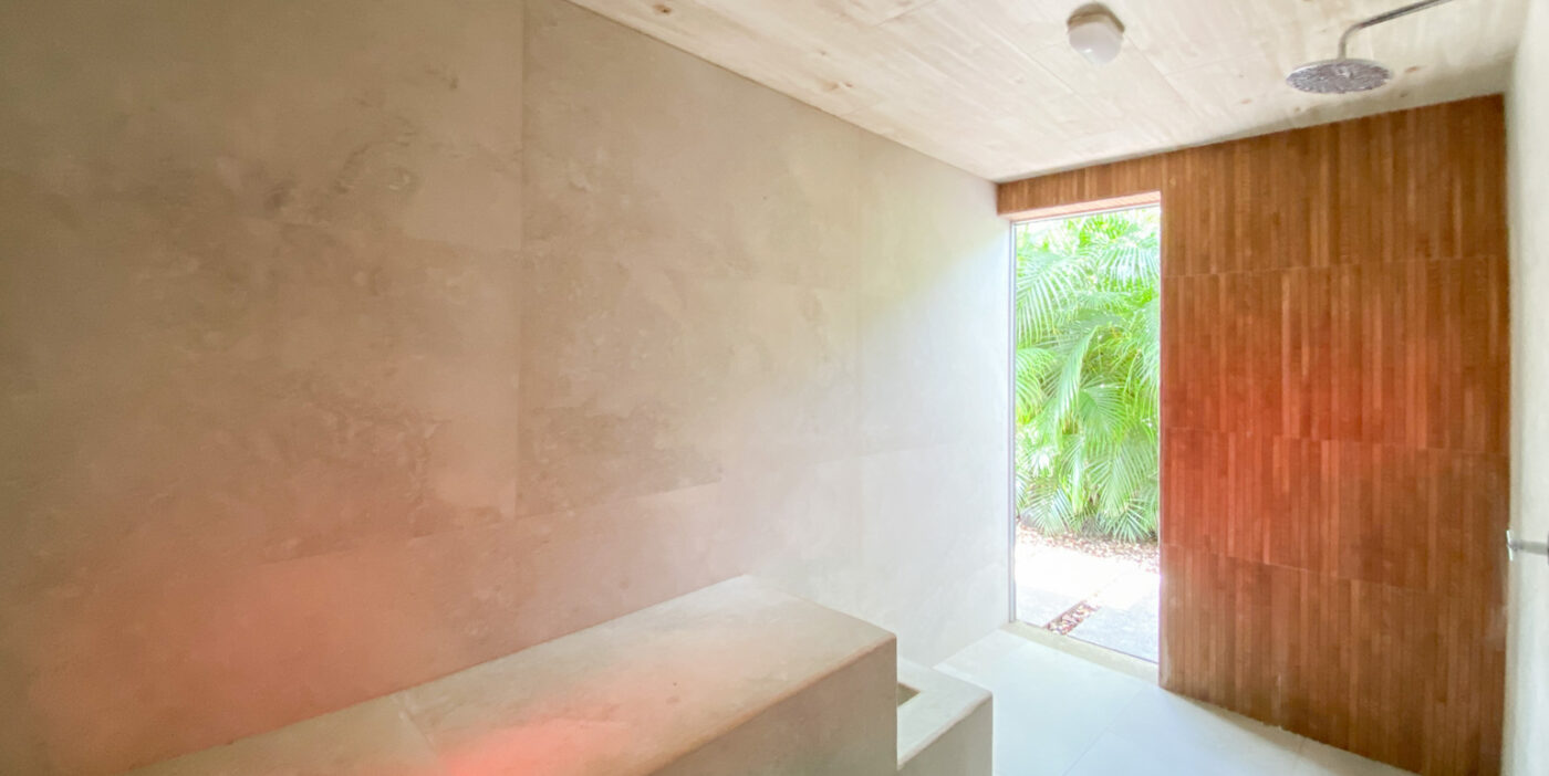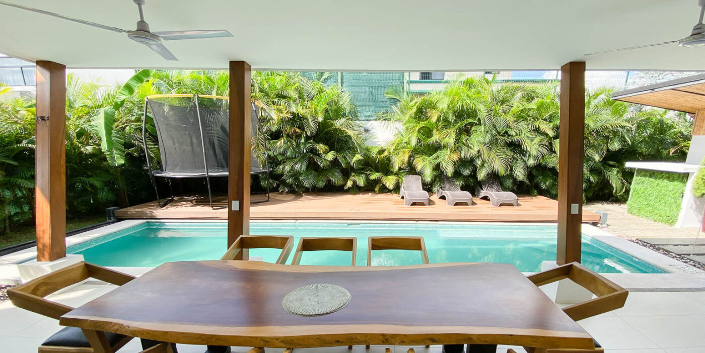 The social area features an open-concept layout integrating the living room, dining area, and kitchen, with direct access to the terrace, deck, and private pool—perfect for enjoying the climate, hosting BBQs, or simply relaxing while surrounded by greenery. As an added feature, the property includes a private sauna / steam room, offering an ideal space for rest and wellness.
